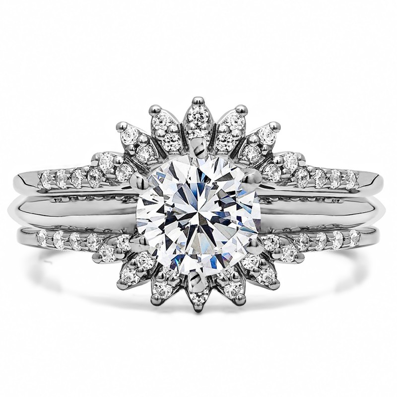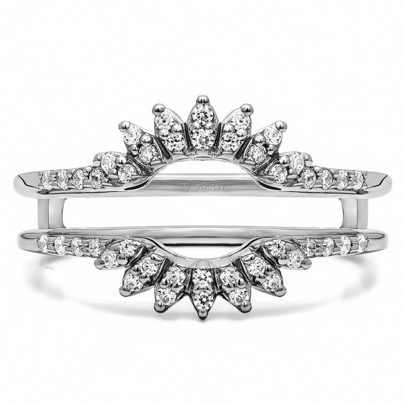 This wedding ring guard has 44 round, prong set stones. Each band measures 2 millimeters wide. This ring guard has 0.2 carats total weight.