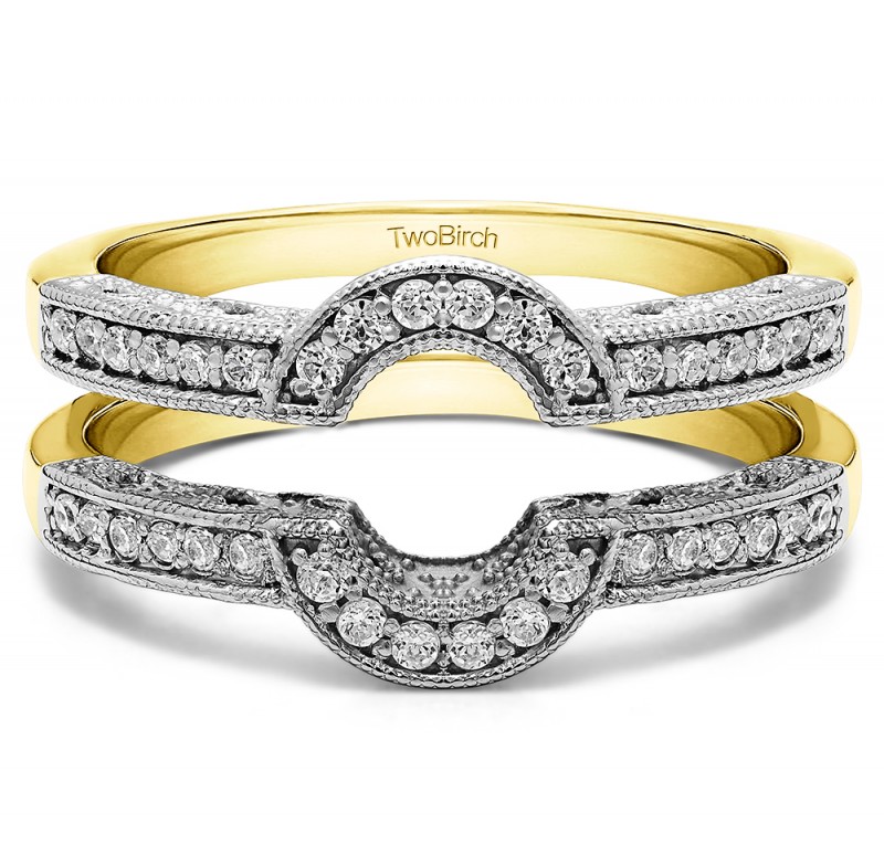 This wedding ring guard has 36 round, channel set stones. Each band measures 2 millimeters wide. This ring guard has 0.21 carats total weight. It is made to fit a round solitaire from 0.5 carats to 1 carats.