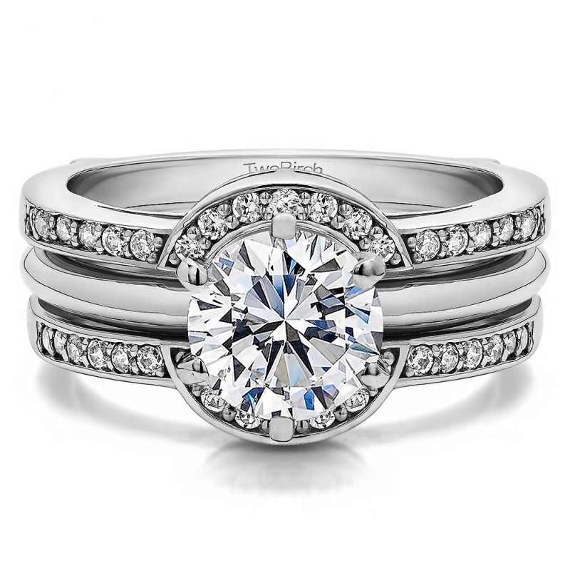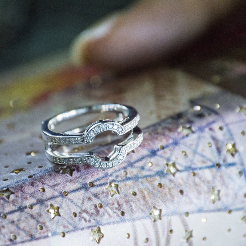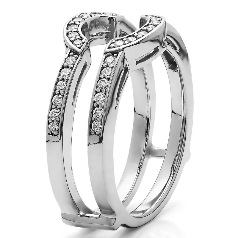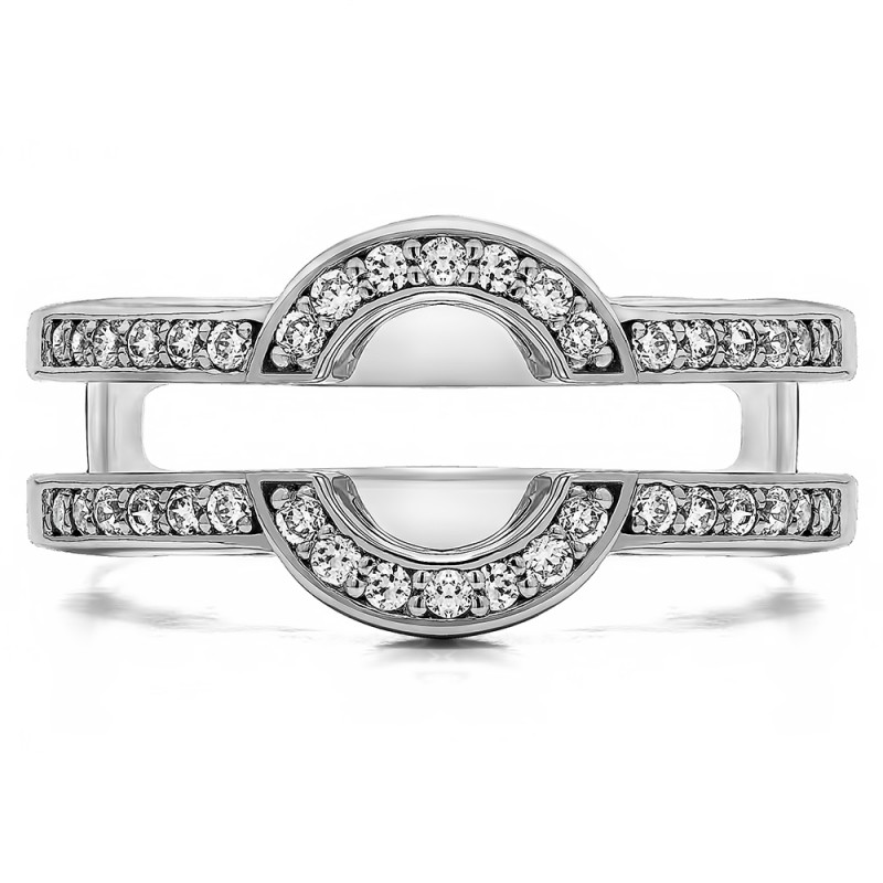 This wedding ring guard has 38 round, channel set stones. Each band measures 2 millimeters wide. This ring guard has 0.38 carats total weight. It is made to fit a round solitaire from 0.5 carats to 1 carats.