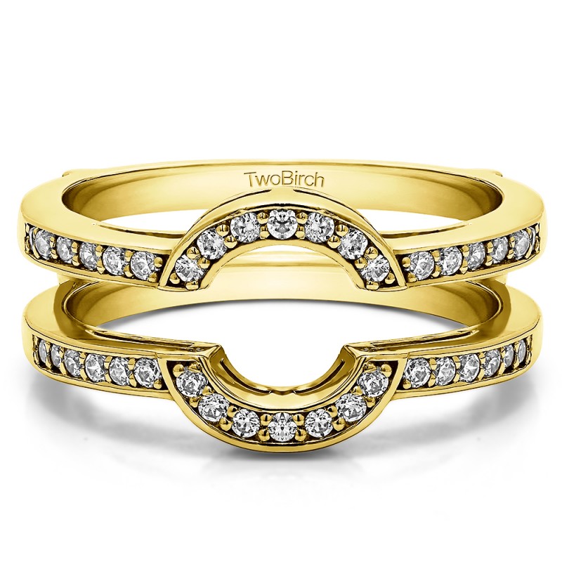 This wedding ring guard has 38 round, channel set stones. Each band measures 2 millimeters wide. This ring guard has 0.38 carats total weight. It is made to fit a round solitaire from 0.5 carats to 1 carats.