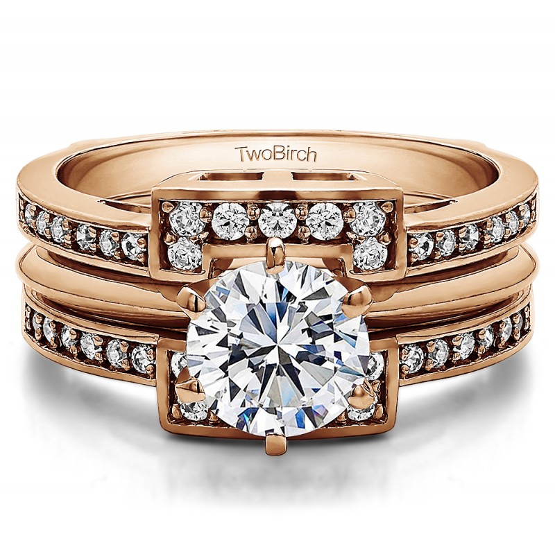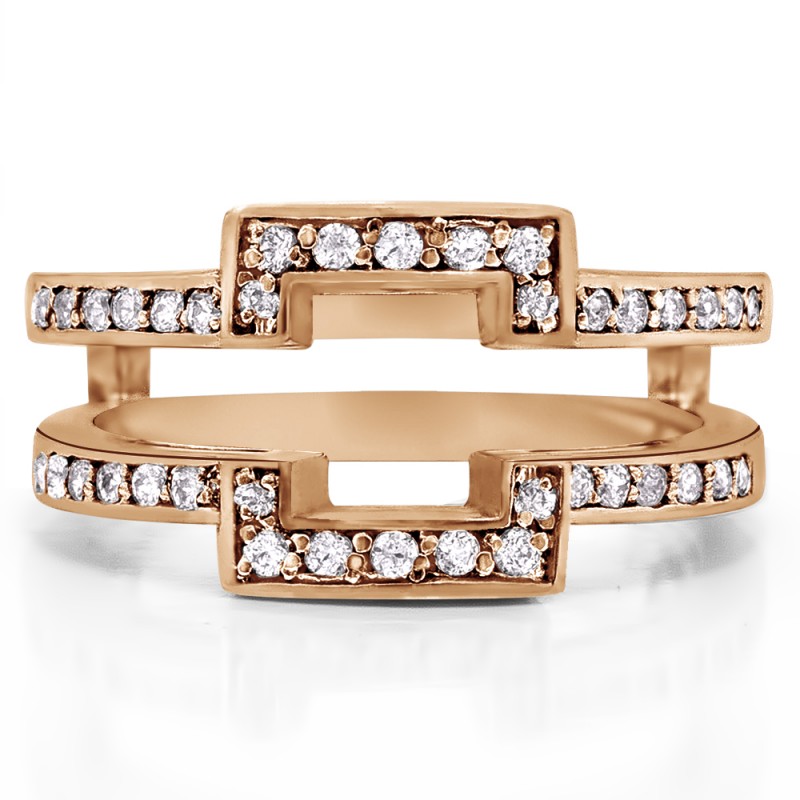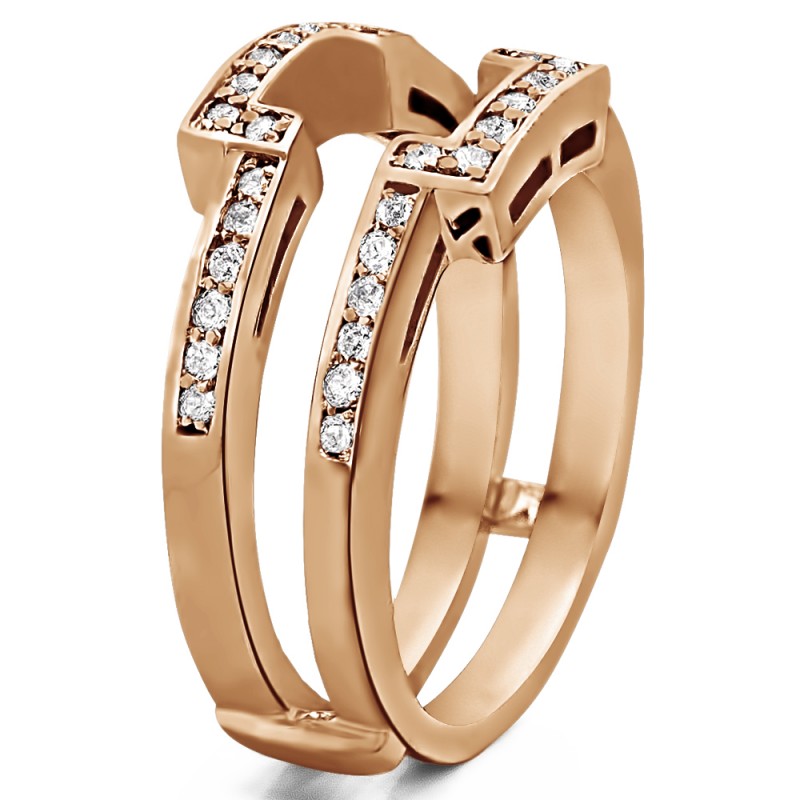 This wedding ring guard has 40 round, channel set stones. Each band measures 2 millimeters wide. This ring guard has 0.5 carats total weight. It is made to fit a round or princess cut solitaire from 0.75 carats to 1.5 carats.