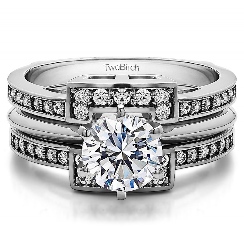 This wedding ring guard has 40 round, channel set stones. Each band measures 2 millimeters wide. This ring guard has 0.5 carats total weight. It is made to fit a round or princess cut solitaire from 0.75 carats to 1.5 carats.