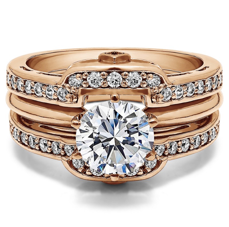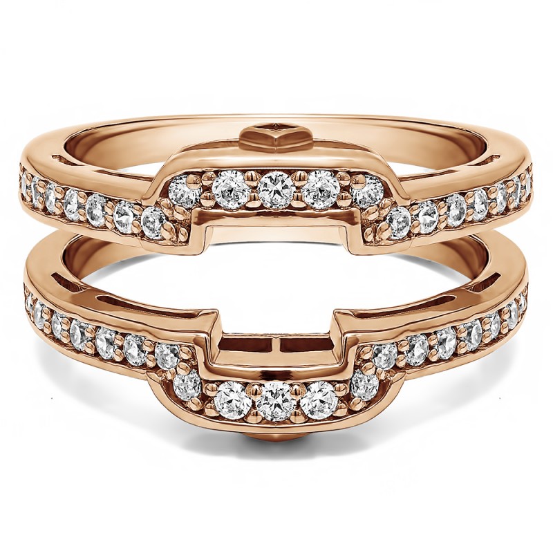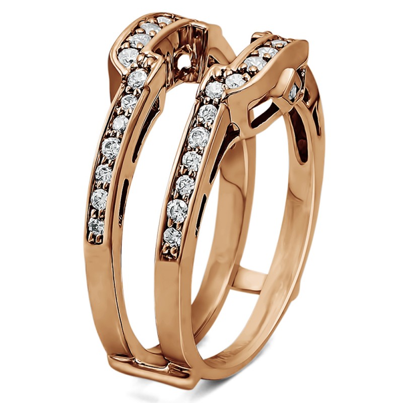 This wedding ring guard has 40 round, channel set stones. Each band measures 2.2 millimeters wide. This ring guard has 0.5 carats total weight. It is made to fit a round solitaire from 0.25 carats to 2, or a princess cut solitaire from 0.5 up to 2 carats.