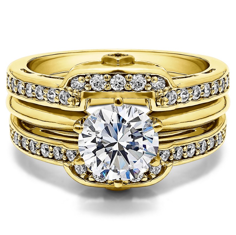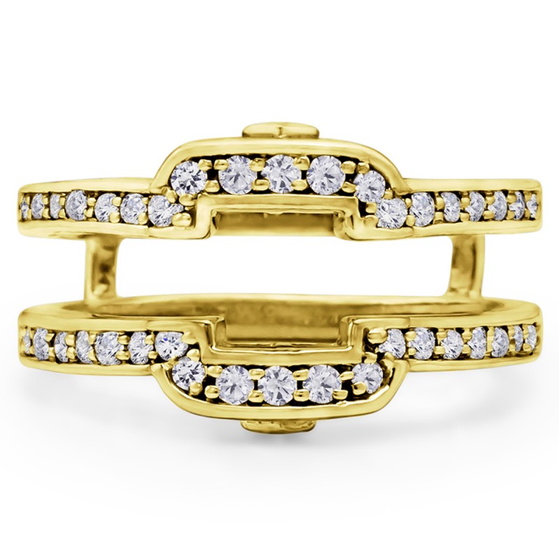 This wedding ring guard has 40 round, channel set stones. Each band measures 2.2 millimeters wide. This ring guard has 0.5 carats total weight. It is made to fit a round solitaire from 0.25 carats to 2, or a princess cut solitaire from 0.5 up to 2 carats.