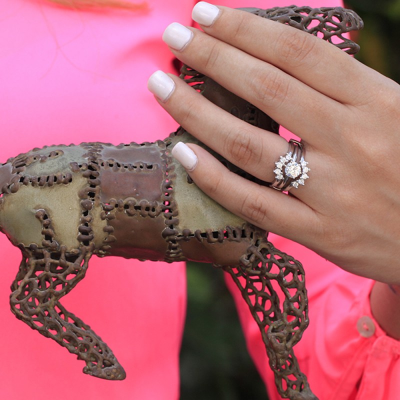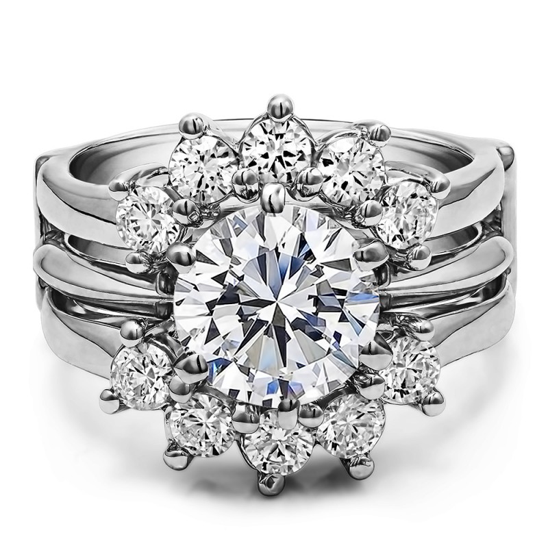 This wedding ring guard has 10 round, prong set stones. Each band measures 2.5 millimeters wide. This ring guard has 0.5 carats total weight. It is made to fit a round solitaire from 0.25 carats to 2, or a princess cut solitaire from 0.5 up to 2 carats.