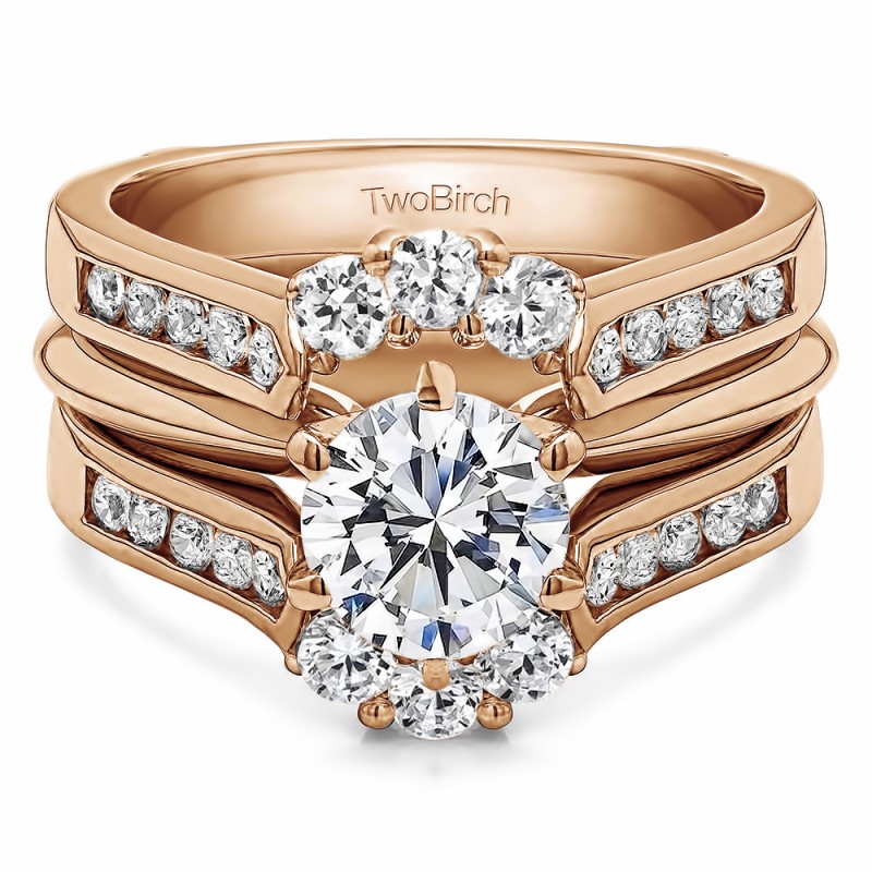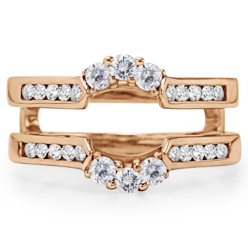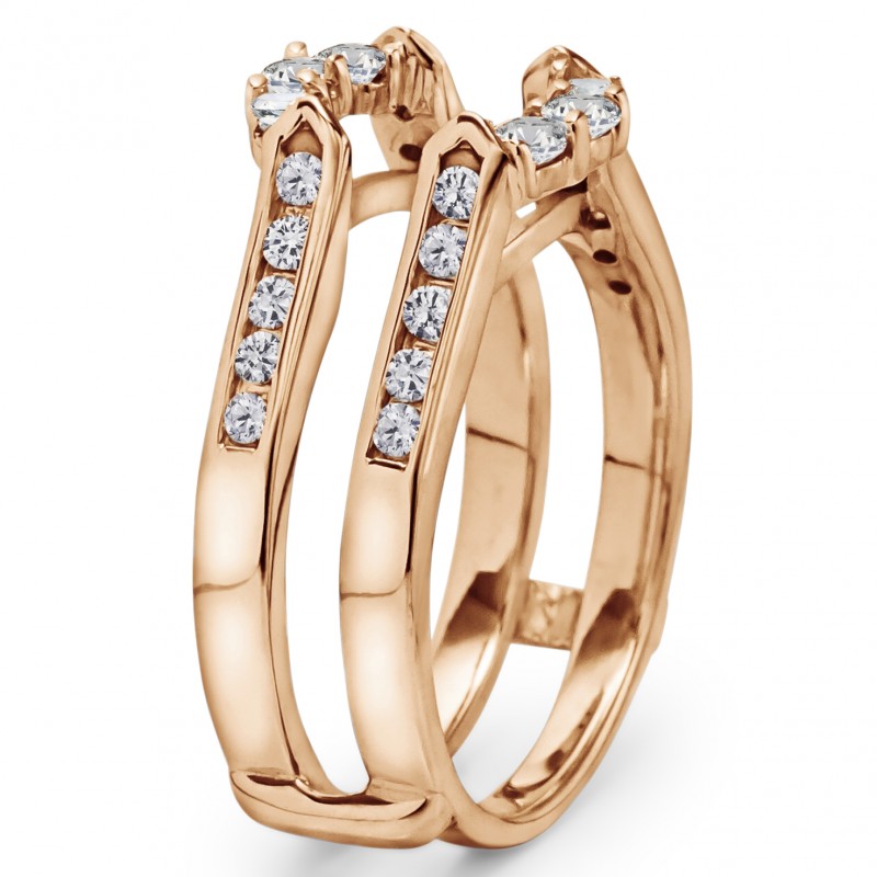 This wedding ring guard has 26 round, channel set stones. Each band measures 2 millimeters wide. This ring guard has 0.54 carats total weight. It is made to fit a round solitaire from 1 carats to 2 carats.