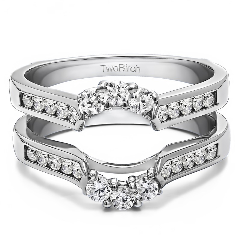 This wedding ring guard has 26 round, channel set stones. Each band measures 2 millimeters wide. This ring guard has 0.54 carats total weight. It is made to fit a round solitaire from 1 carats to 2 carats.