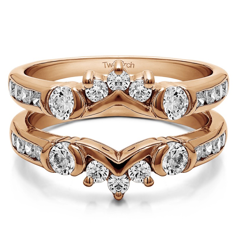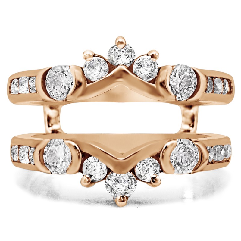 This wedding ring guard has 26 round, prong set stones. Each band measures 2.3 millimeters wide. This ring guard has 1.01 carats total weight. It is made to fit a round solitaire from 0.5 carats to 2, or a princess cut solitaire from 0.5 up to 1.5 carats.