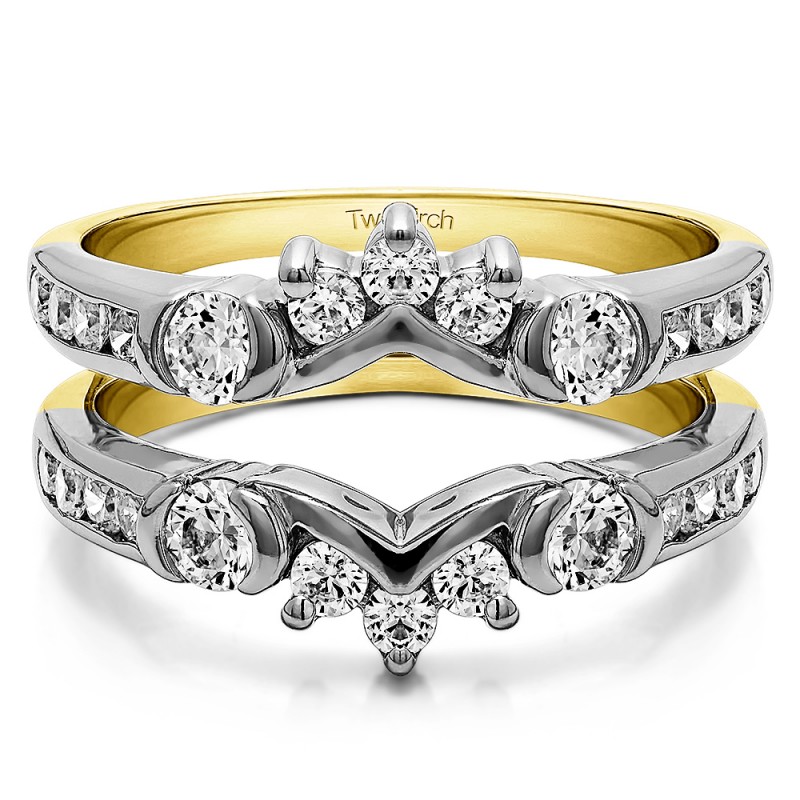 This wedding ring guard has 26 round, prong set stones. Each band measures 2.3 millimeters wide. This ring guard has 1.01 carats total weight. It is made to fit a round solitaire from 0.5 carats to 2, or a princess cut solitaire from 0.5 up to 1.5 carats.