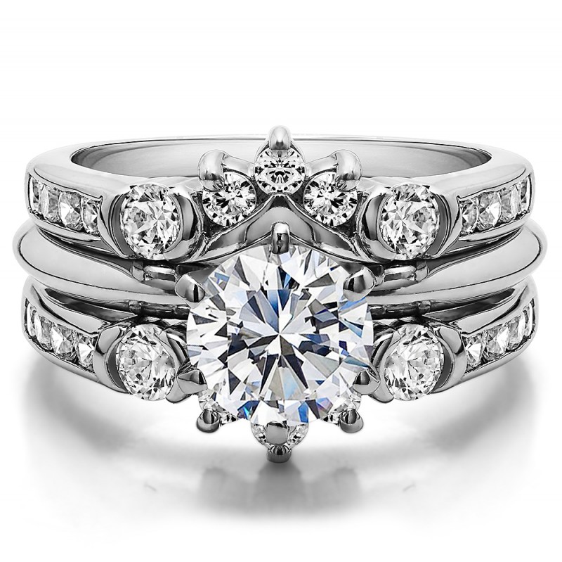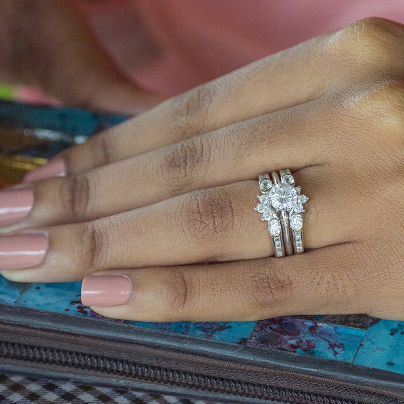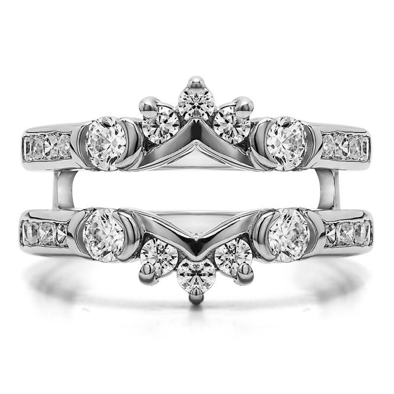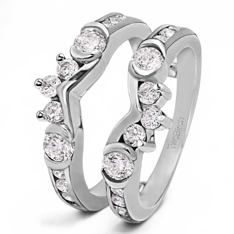 This wedding ring guard has 26 round, prong set stones. Each band measures 2.3 millimeters wide. This ring guard has 1.01 carats total weight. It is made to fit a round solitaire from 0.5 carats to 2, or a princess cut solitaire from 0.5 up to 1.5 carats.