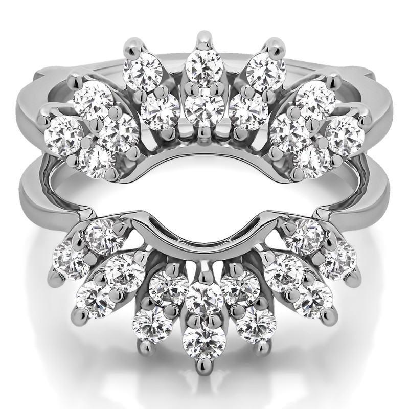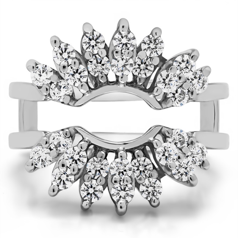 This wedding ring guard has 28 round, prong set stones. Each band measures 1.58 millimeters wide. This ring guard has 0.98 carats total weight. It is made to fit a round solitaire from 0.5 carats to 2, or a princess cut solitaire from 0.5 up to 1.5 carats.