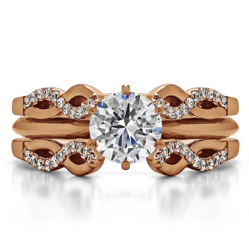 This wedding ring guard has 44 round, prong set stones. Each band measures 2 millimeters wide. This ring guard has 0.22 carats total weight.