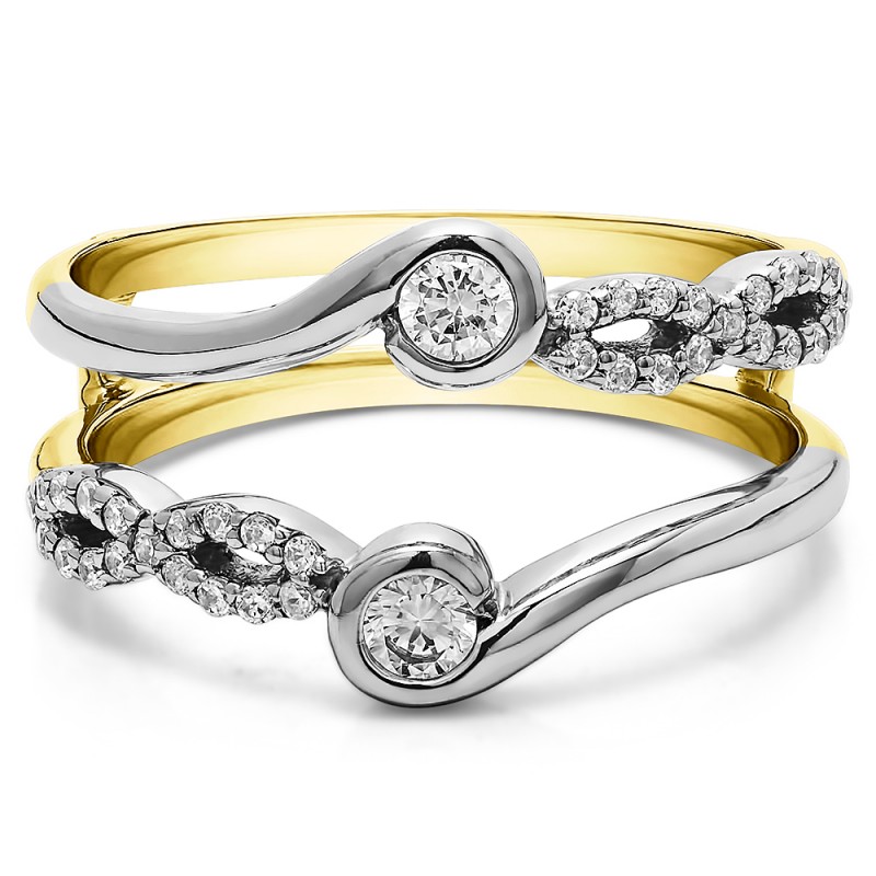 This wedding ring guard has 38 round, prong set stones. Each band measures 2 millimeters wide. This ring guard has 0.34 carats total weight.