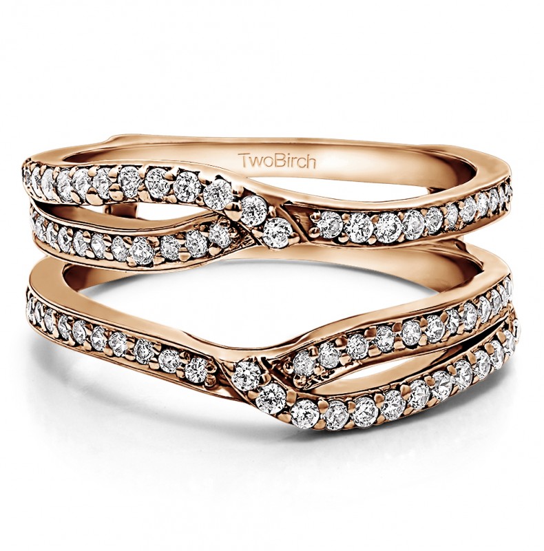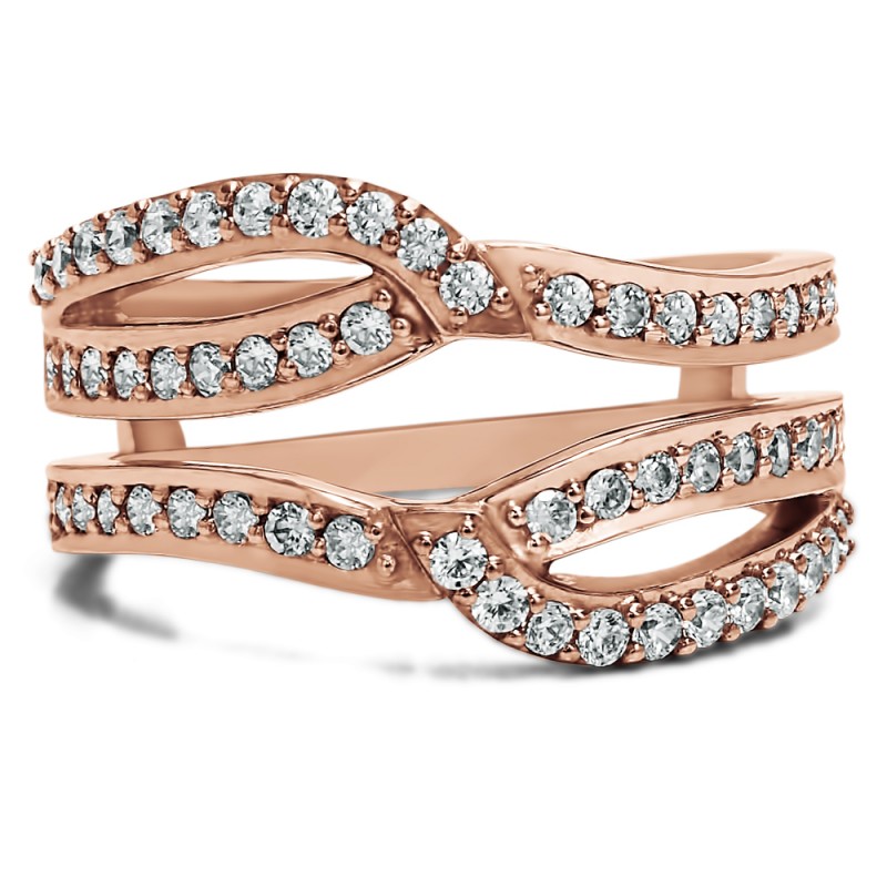 This wedding ring guard has 74 round, prong set stones. Each band measures 2.1 millimeters wide. This ring guard has 0.44 carats total weight. It is made to fit a round or princess cut solitaire from 0.5 carats to 2, or a marquise solitaire from 0.75 up to 1.5 carats.