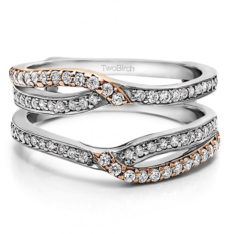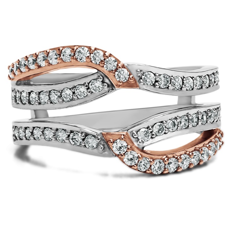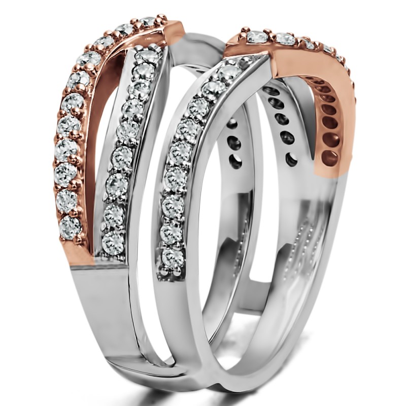 This wedding ring guard has 74 round, prong set stones. Each band measures 2.1 millimeters wide. This ring guard has 0.44 carats total weight. It is made to fit a round or princess cut solitaire from 0.5 carats to 2, or a marquise solitaire from 0.75 up to 1.5 carats.