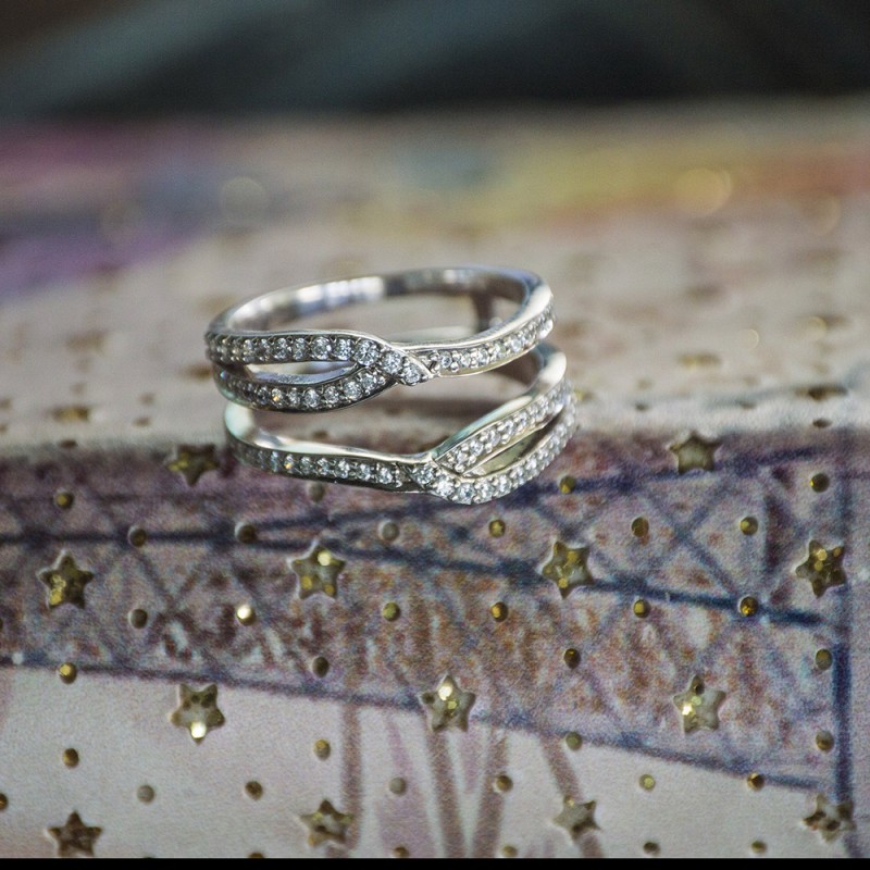 This wedding ring guard has 74 round, prong set stones. Each band measures 2.1 millimeters wide. This ring guard has 0.44 carats total weight. It is made to fit a round or princess cut solitaire from 0.5 carats to 2, or a marquise solitaire from 0.75 up to 1.5 carats.