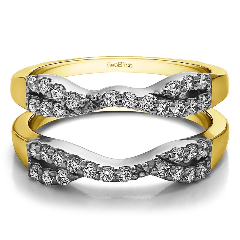 This wedding ring guard has 34 round, prong set stones. Each band measures 2 millimeters wide. This ring guard has 0.51 carats total weight. It is made to fit a round solitaire from 0.5 carats to 1.5, or a princess cut solitaire from 0.5 up to 2, or a marquise solitaire from 0.5 up to 1 carats.