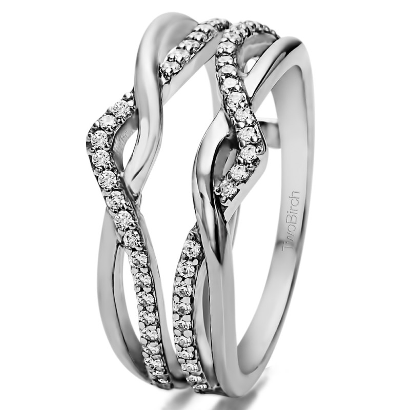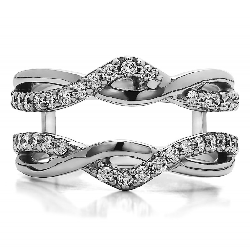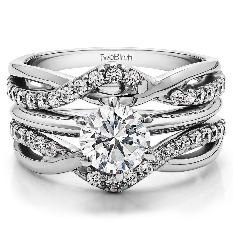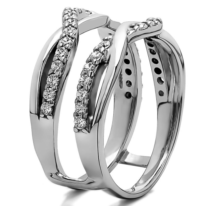 This wedding ring guard has 38 round, prong set stones. Each band measures 2.2 millimeters wide. This ring guard has 0.57 carats total weight. It is made to fit a round or princess solitaire from 1 carats to 1.5, or a princess cut solitaire from 0.75 up to 2 carats.