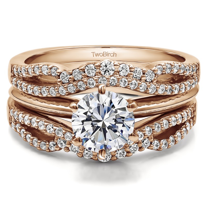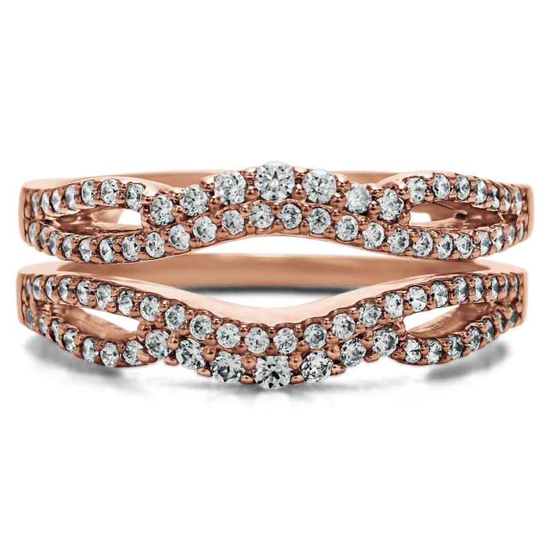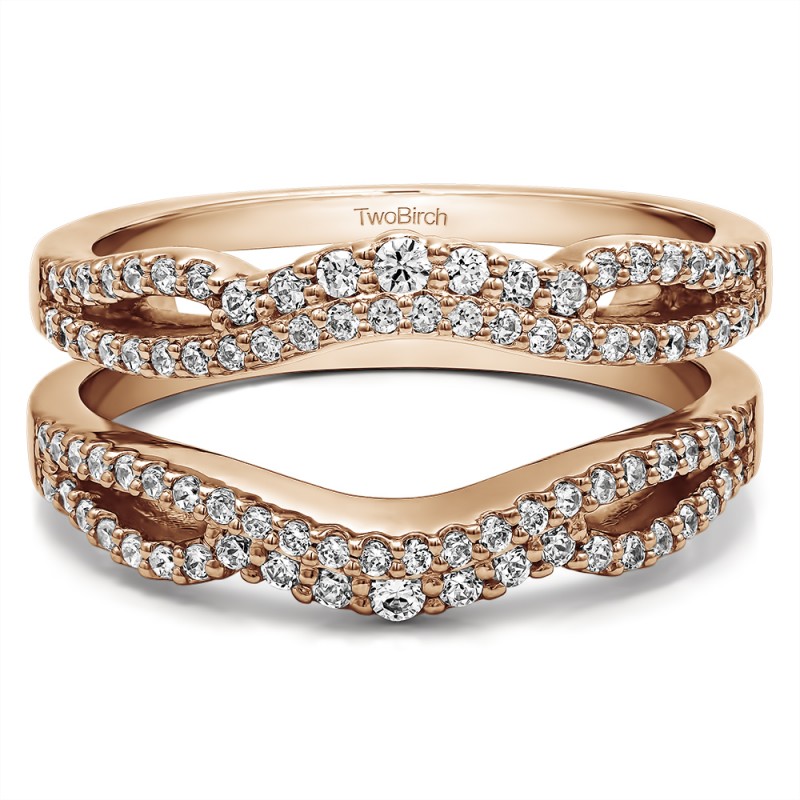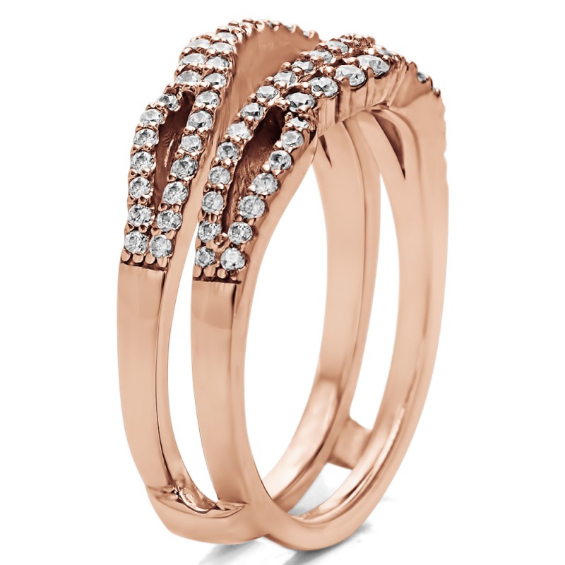 This wedding ring guard has 90 round, prong set stones. Each band measures 1.8 millimeters wide. This ring guard has 0.57 carats total weight. It is made to fit a round solitaire from 0.5 carats to 1.75, or a princess cut solitaire from 0.5 up to 2, or a marquise solitaire from 0.75 up to 1.5 carats.