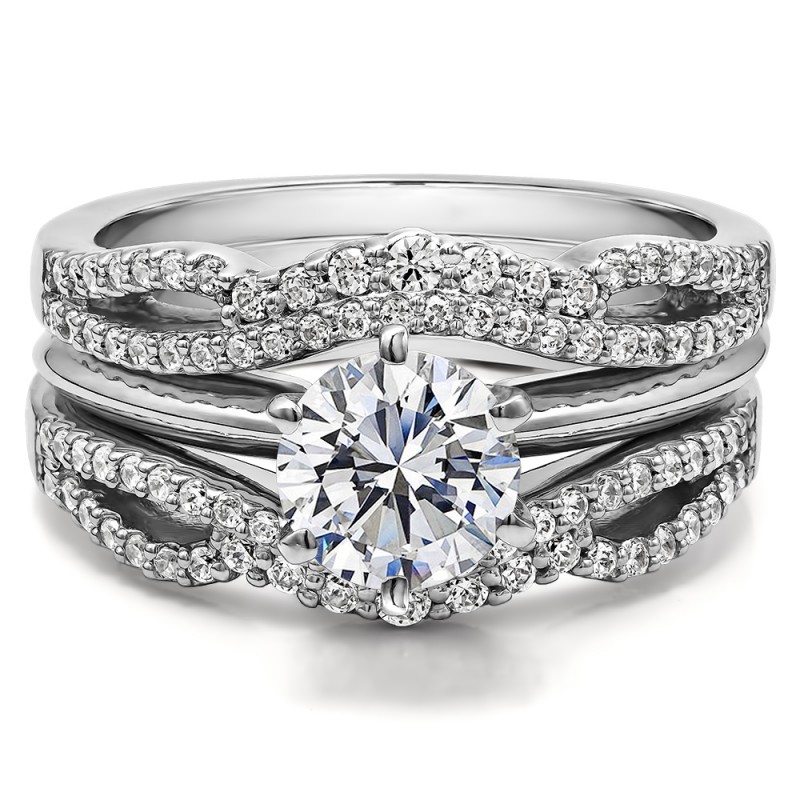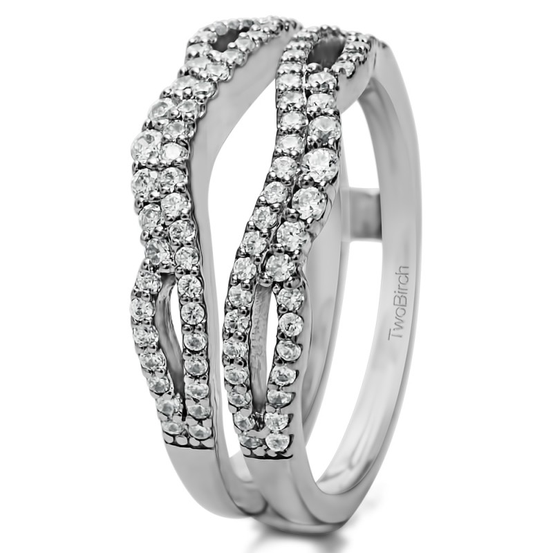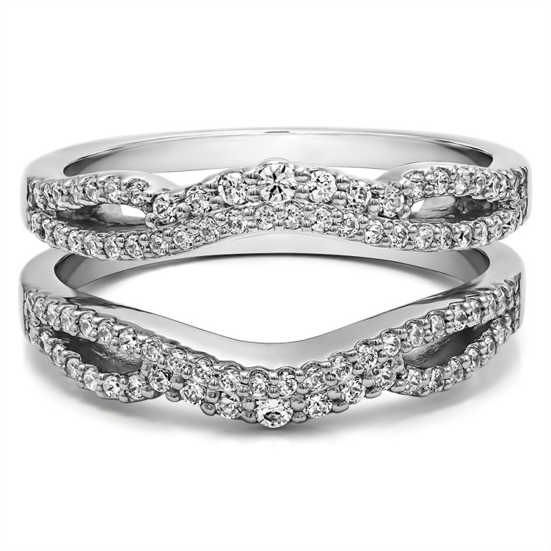 This wedding ring guard has 90 round, prong set stones. Each band measures 1.8 millimeters wide. This ring guard has 0.57 carats total weight. It is made to fit a round solitaire from 0.5 carats to 1.75, or a princess cut solitaire from 0.5 up to 2, or a marquise solitaire from 0.75 up to 1.5 carats.