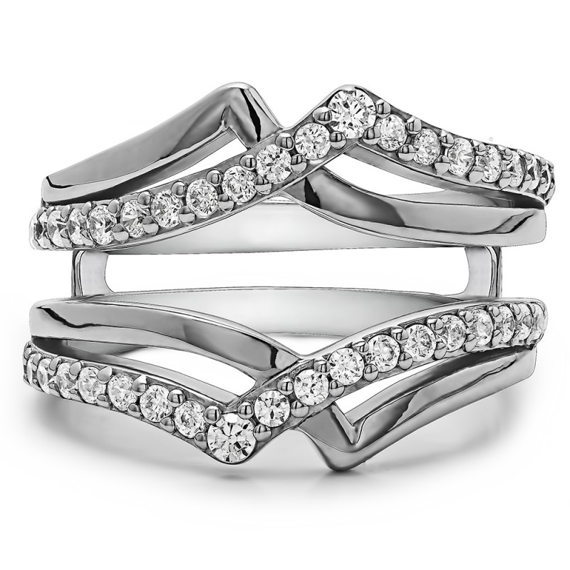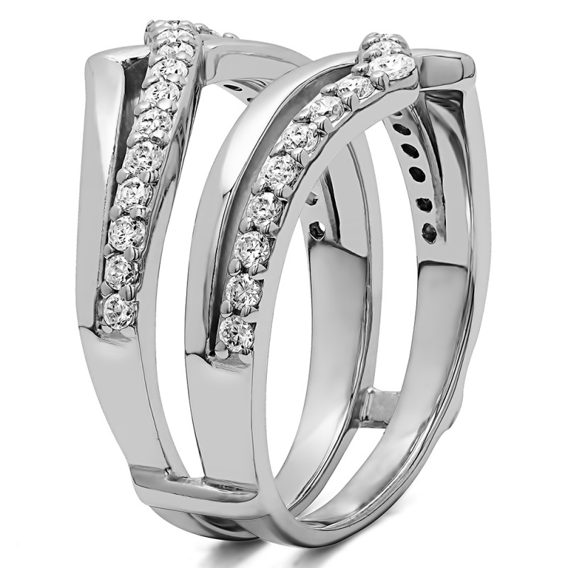 This wedding ring guard has 40 round, prong set stones. Each band measures 2 millimeters wide. This ring guard has 0.73 carats total weight. It is made to fit a round or princess cut solitaire from 0.5 carats to 2, or a marquise solitaire from 0.75 up to 1.5 carats.
