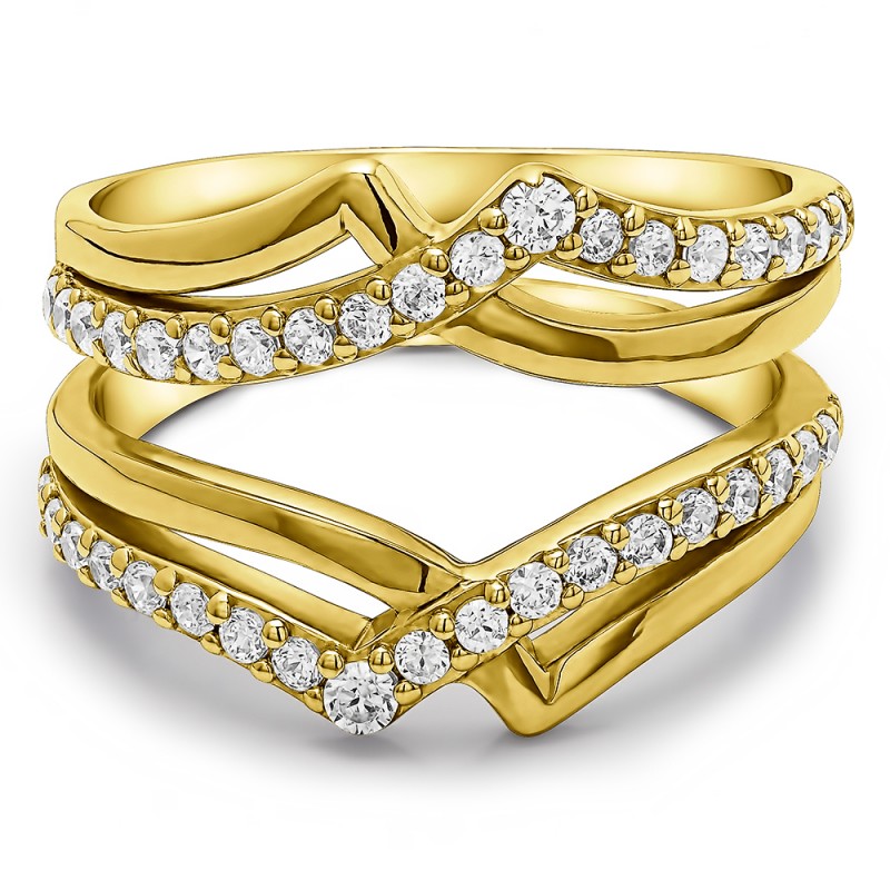 This wedding ring guard has 40 round, prong set stones. Each band measures 2 millimeters wide. This ring guard has 0.73 carats total weight. It is made to fit a round or princess cut solitaire from 0.5 carats to 2, or a marquise solitaire from 0.75 up to 1.5 carats.