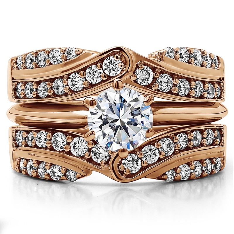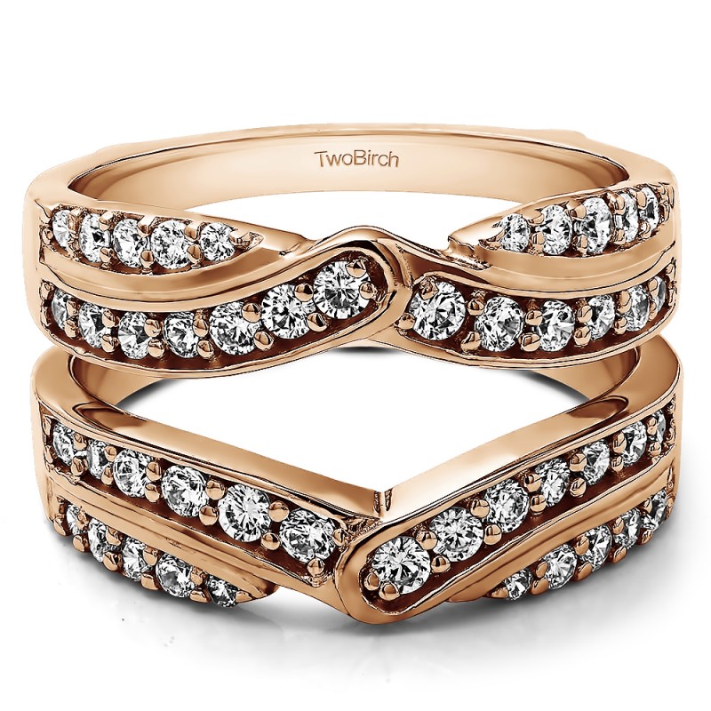 This wedding ring guard has 28 round, prong set stones. Each band measures 2 millimeters wide. This ring guard has .75 carats total weight. It is made to fit a round or princess cut solitaire from 0.5 carats to 2, or a marquise solitaire from 0.5 up to 1.5 carats.