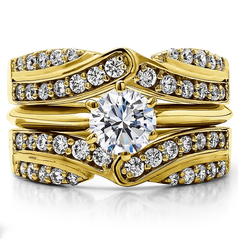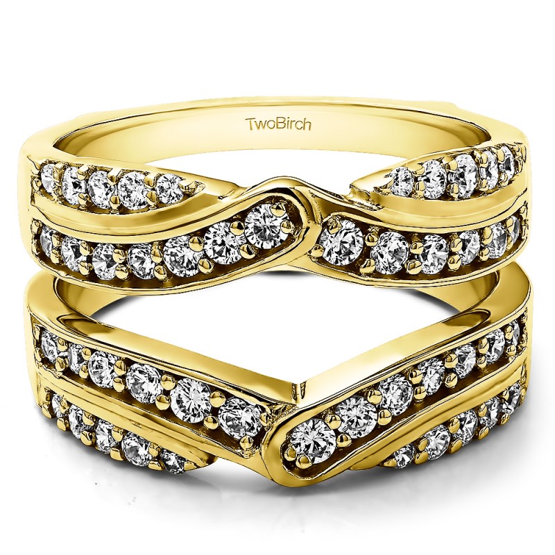 This wedding ring guard has 28 round, prong set stones. Each band measures 2 millimeters wide. This ring guard has .75 carats total weight. It is made to fit a round or princess cut solitaire from 0.5 carats to 2, or a marquise solitaire from 0.5 up to 1.5 carats.