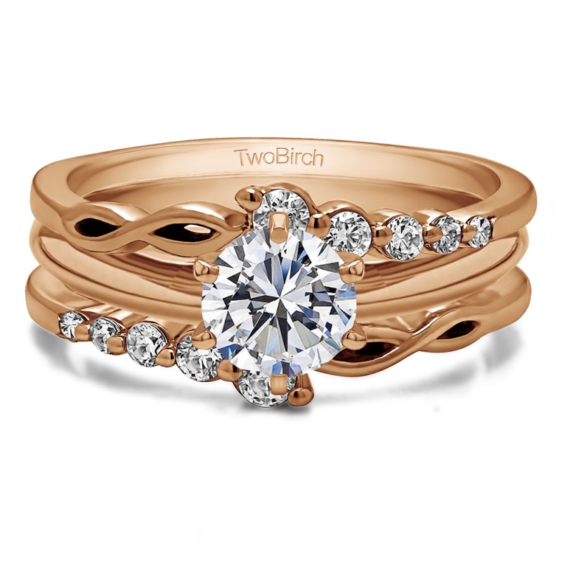 This wedding ring guard has 10 round, prong set stones. Each band measures 1.28 millimeters wide. This ring guard has 0.25 carats total weight. It is made to fit a round, princess or marquise cut solitaire from 0.25 carats to 1.5 carats.