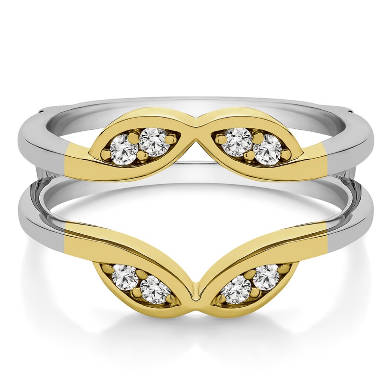 This wedding ring guard has 8 round, prong set stones. Each band measures 1.76 millimeters wide. This ring guard has 0.2 carats total weight. It is made to fit a round solitaire from 0.75 carats to 2, or a princess cut solitaire from 1 up to 2, or a marquise solitaire from 0.5 up to 1.5 carats.