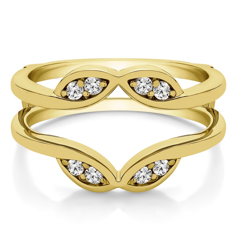 This wedding ring guard has 8 round, prong set stones. Each band measures 1.76 millimeters wide. This ring guard has 0.2 carats total weight. It is made to fit a round solitaire from 0.75 carats to 2, or a princess cut solitaire from 1 up to 2, or a marquise solitaire from 0.5 up to 1.5 carats.