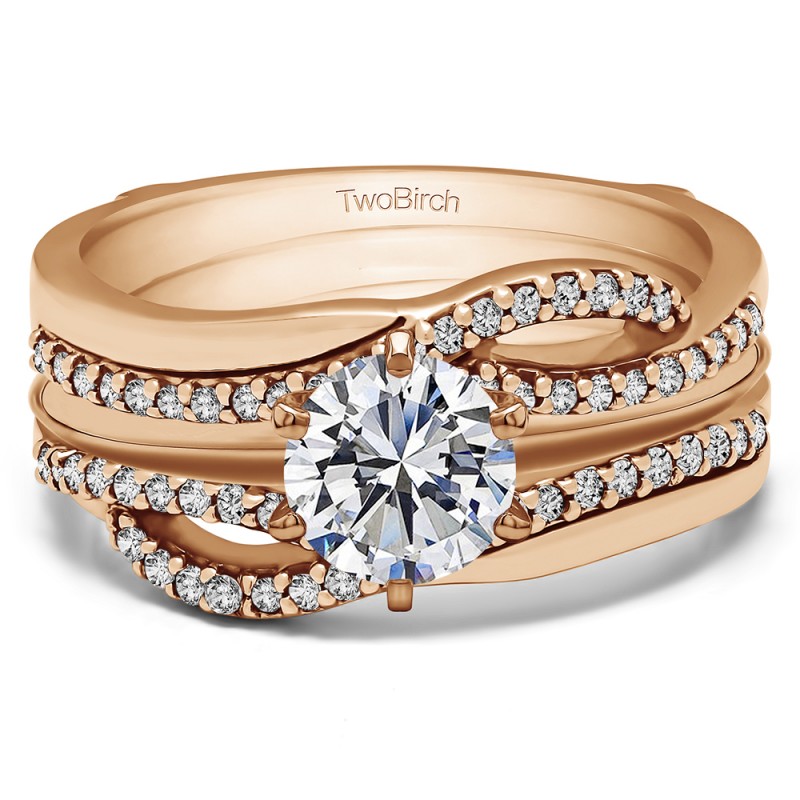 This wedding ring guard has 58 round, prong set stones. Each band measures 2.03 millimeters wide. This ring guard has 0.39 carats total weight. It is made to fit a round solitaire from 0.5 carats to 2, or a princess or marquise cut solitaire from 0.5 up to 1.5 carats.