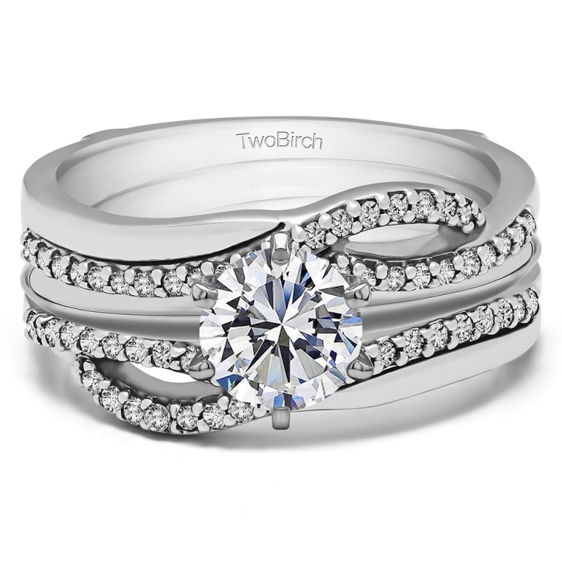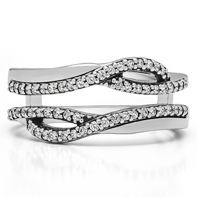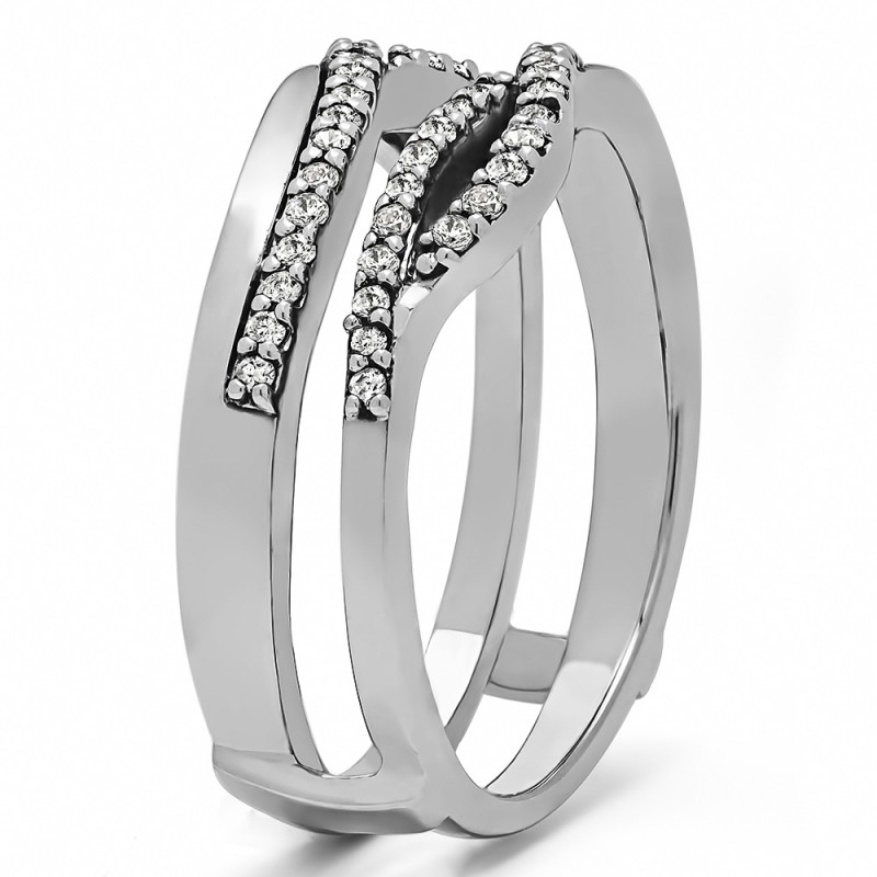 This wedding ring guard has 58 round, prong set stones. Each band measures 2.03 millimeters wide. This ring guard has 0.39 carats total weight. It is made to fit a round solitaire from 0.5 carats to 2, or a princess or marquise cut solitaire from 0.5 up to 1.5 carats.