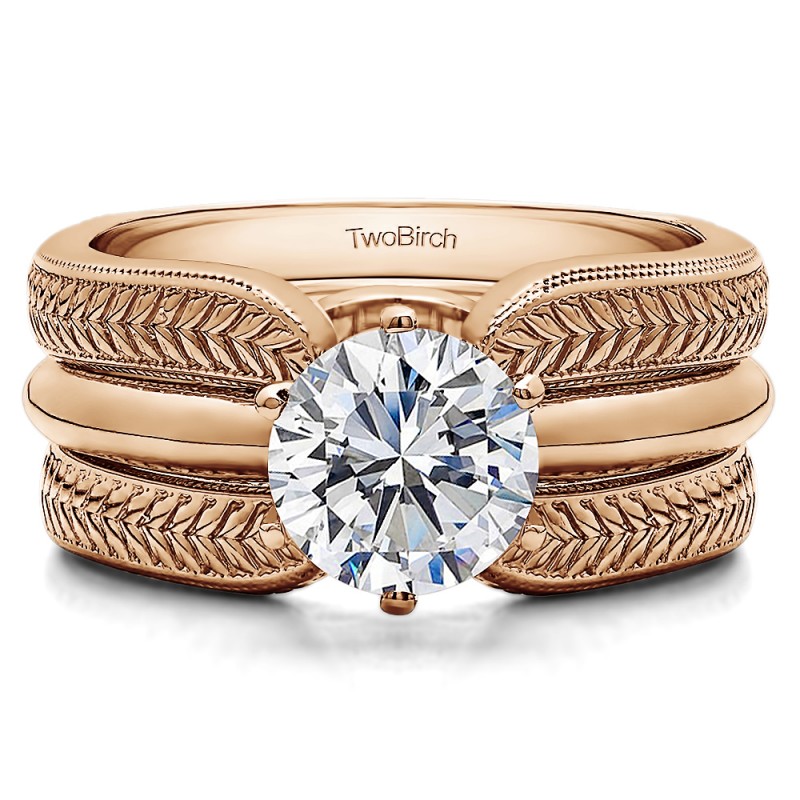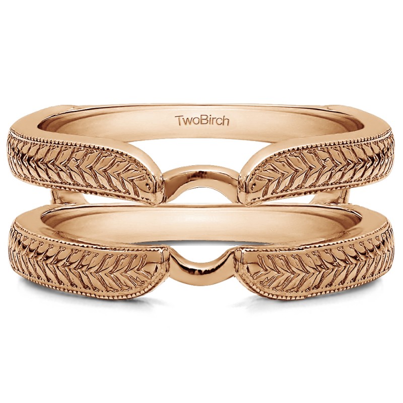 This ring guard has no stones, but has an engraved design on the shank with a cathedral slope. It is made to fit a round or princess cut solitaire from 0.25 carats to 1.5, or a marquise solitaire from 0.25 up to 0.5 carats.