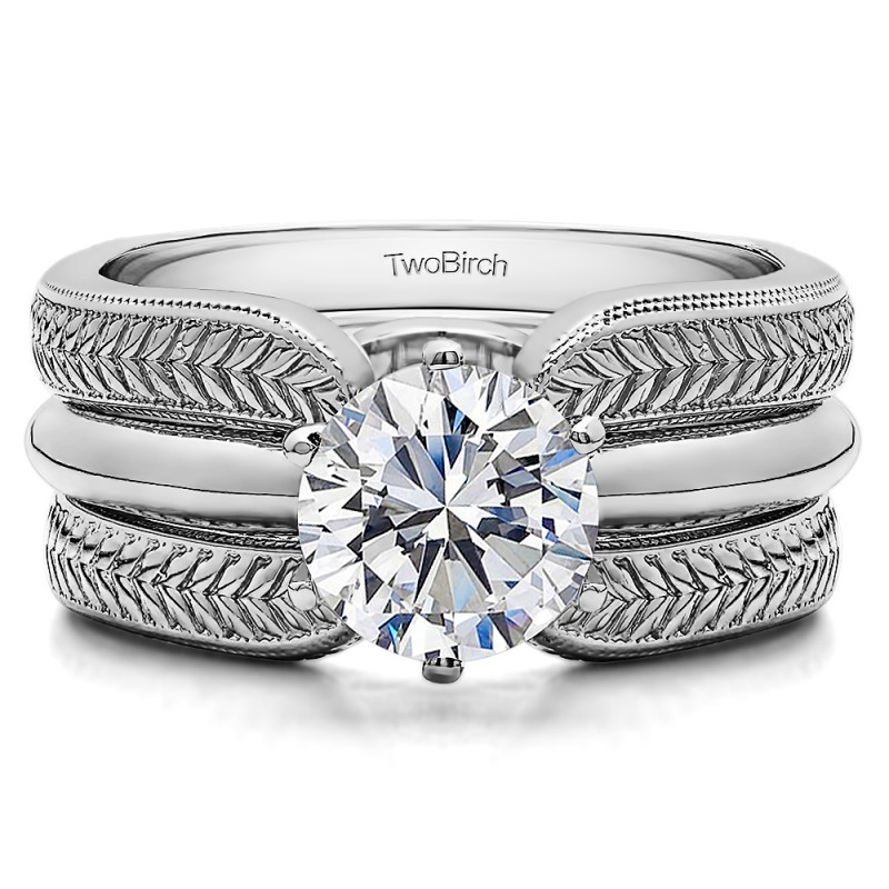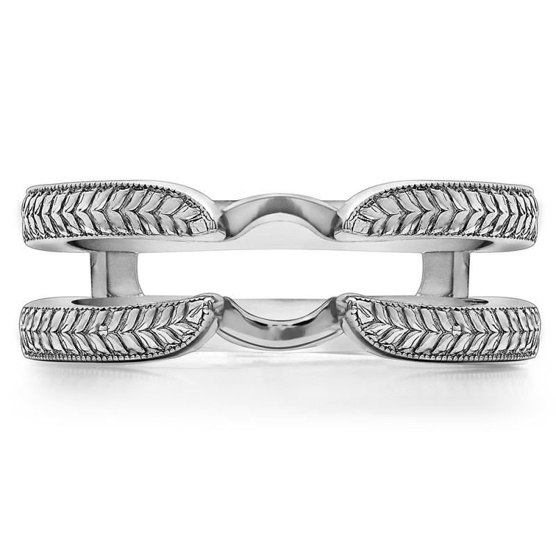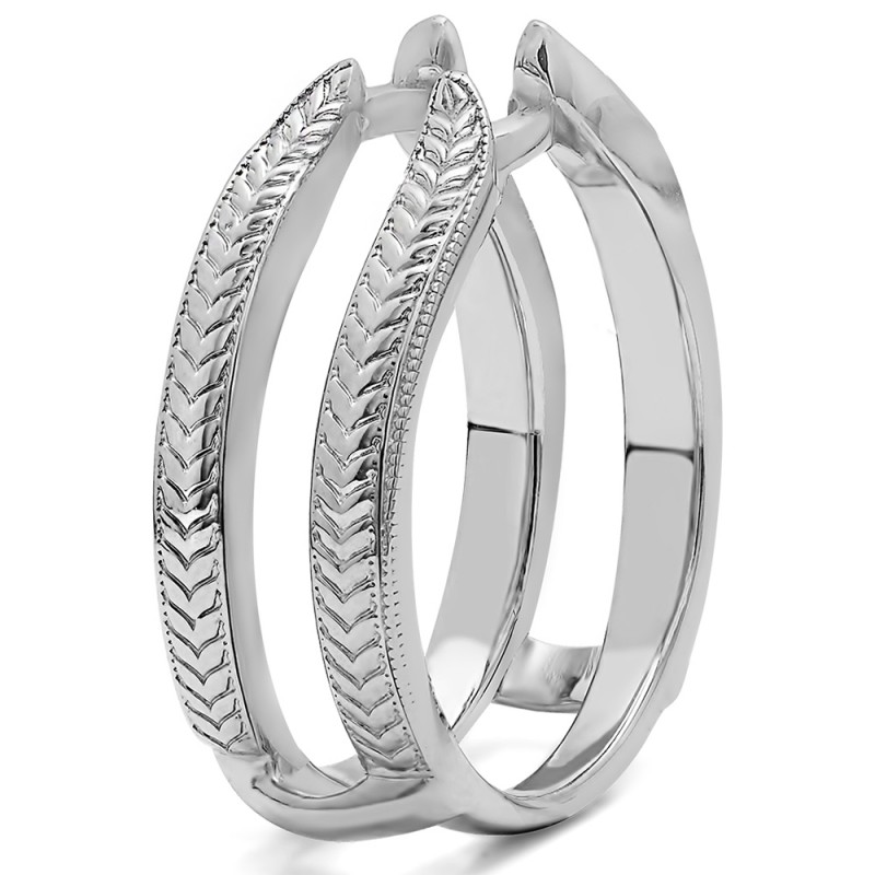 This ring guard has no stones, but has an engraved design on the shank with a cathedral slope. It is made to fit a round or princess cut solitaire from 0.25 carats to 1.5, or a marquise solitaire from 0.25 up to 0.5 carats.