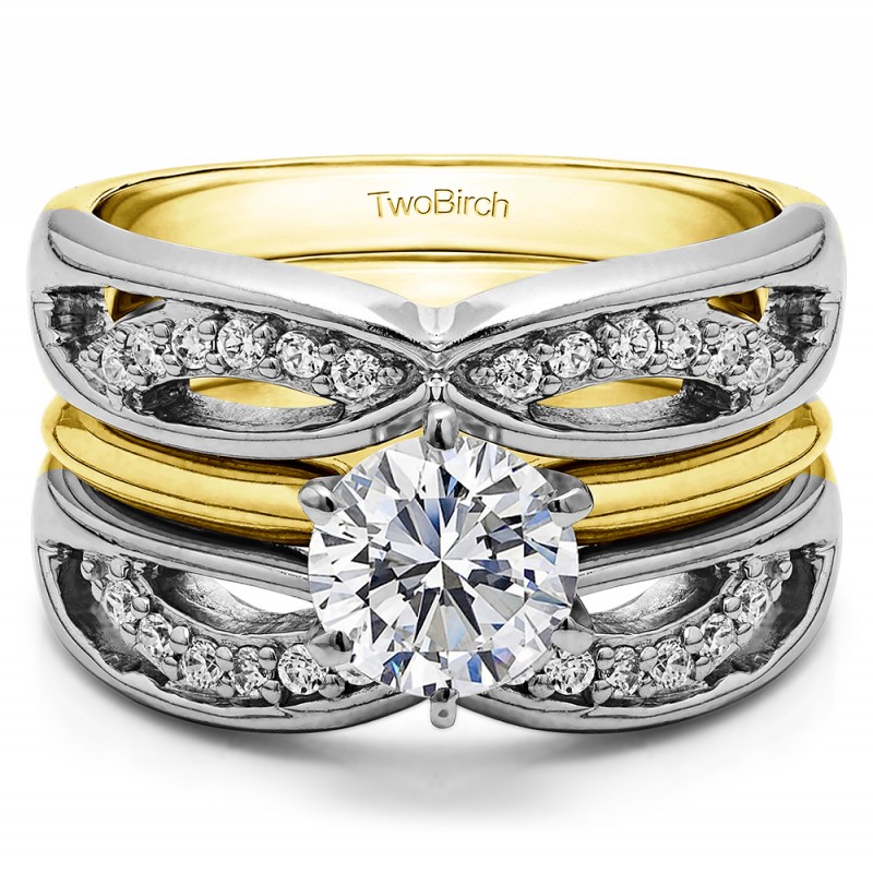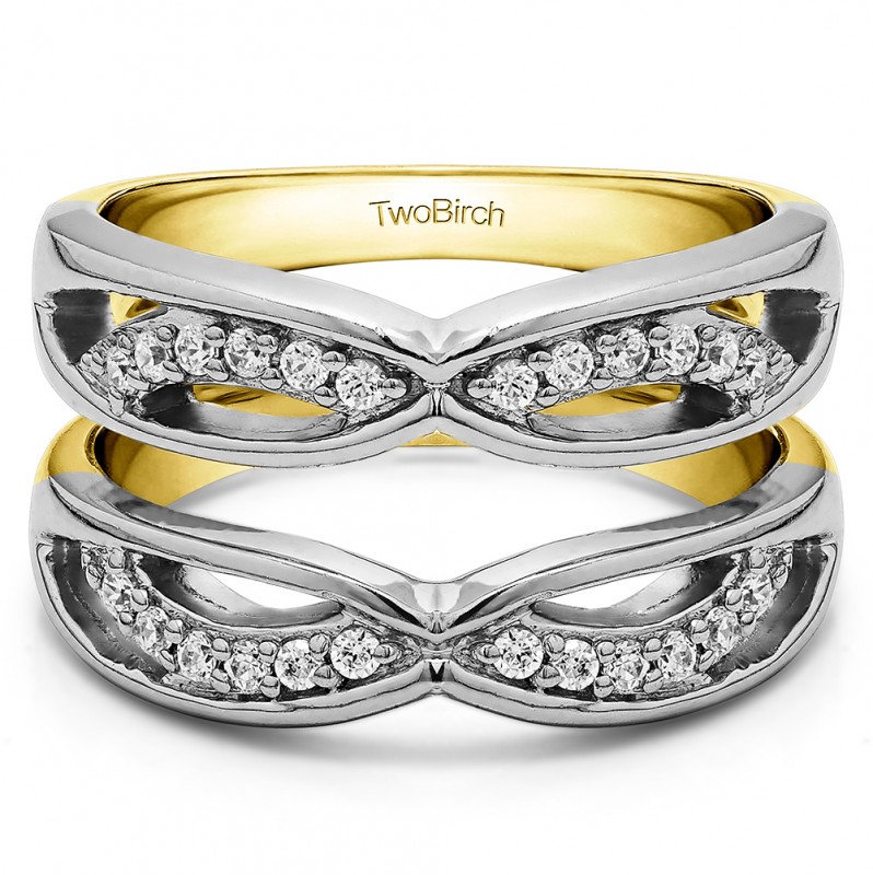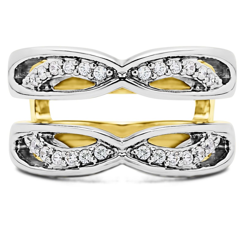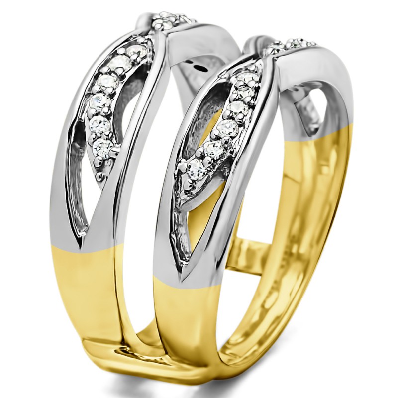 This wedding ring guard has 24 round, channel set stones. Each band measures 2.5 millimeters wide. This ring guard has 0.24 carats total weight. It is made to fit a round or princess cut solitaire from 0.25 carats to 2 carats.