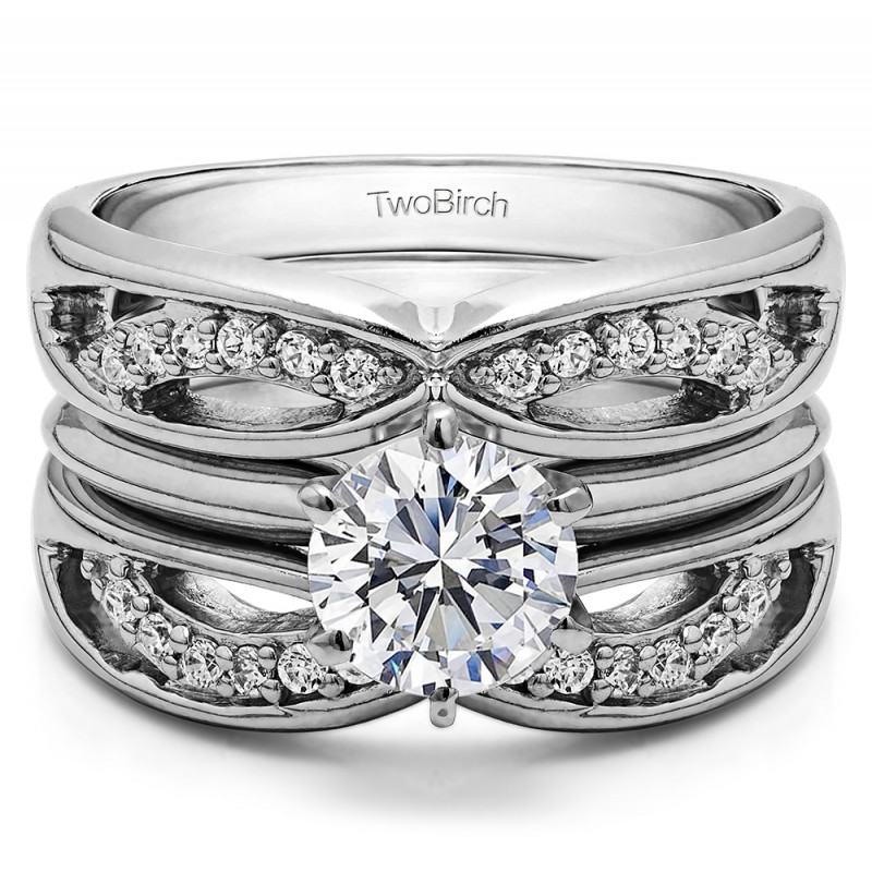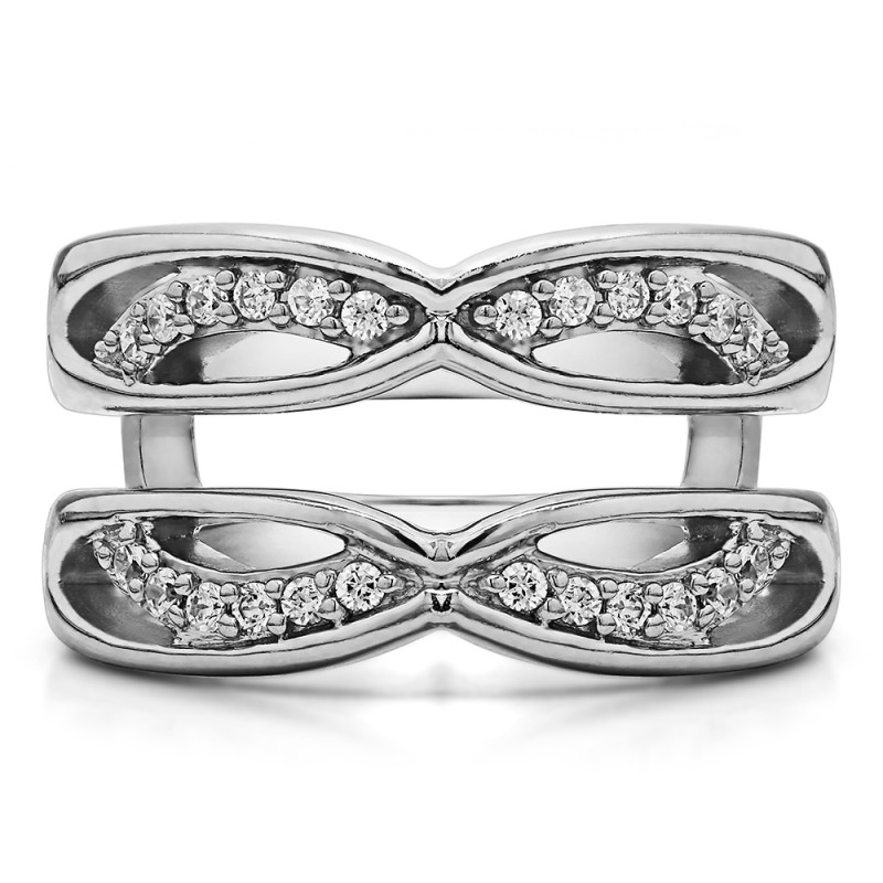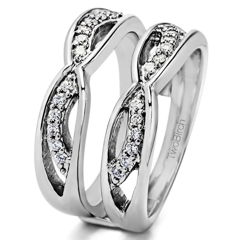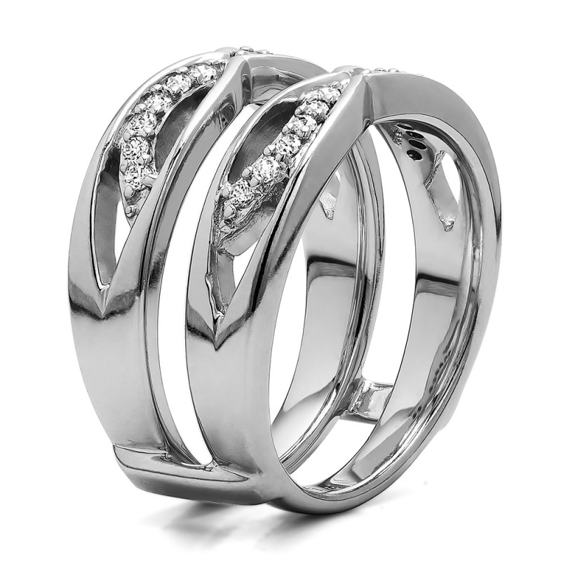 This wedding ring guard has 24 round, channel set stones. Each band measures 2.5 millimeters wide. This ring guard has 0.24 carats total weight. It is made to fit a round or princess cut solitaire from 0.25 carats to 2 carats.