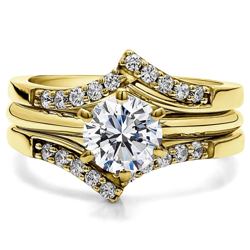 This wedding ring guard has 20 round, channel set stones. Each band measures 2 millimeters wide. This ring guard has 0.3 carats total weight.