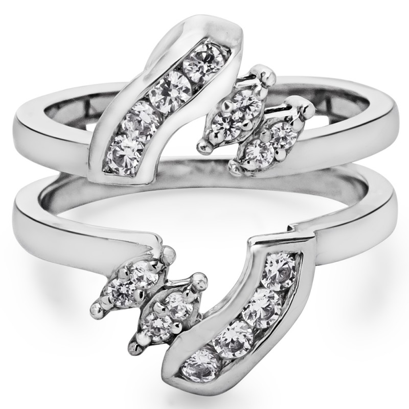 This wedding ring guard has 16 round, channel set stones. Each band measures 2.6 millimeters wide. This ring guard has 0.36 carats total weight. It is made to fit a round or princess cut solitaire from 0.25 carats to 2 carats.