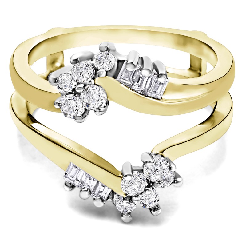 This wedding ring guard has 16 round, prong set stones. Each band measures 2 millimeters wide. This ring guard has 0.48 carats total weight. It is made to fit a round solitaire from 0.5 carats to 0.75 carats.