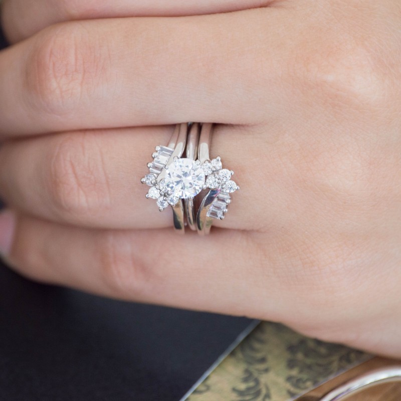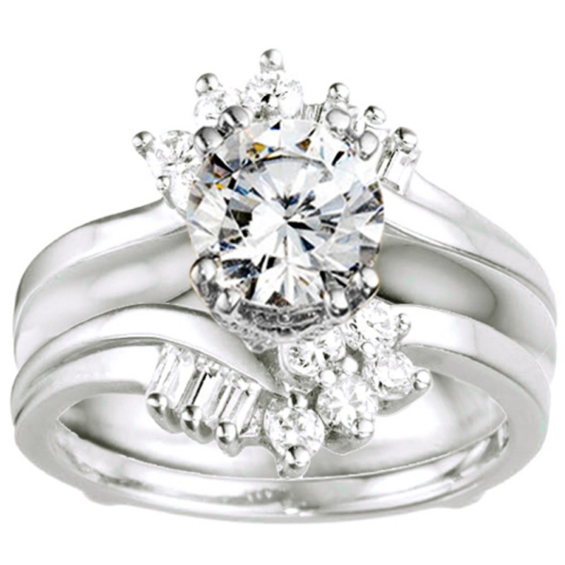 This wedding ring guard has 16 round, prong set stones. Each band measures 2 millimeters wide. This ring guard has 0.48 carats total weight. It is made to fit a round solitaire from 0.5 carats to 0.75 carats.
