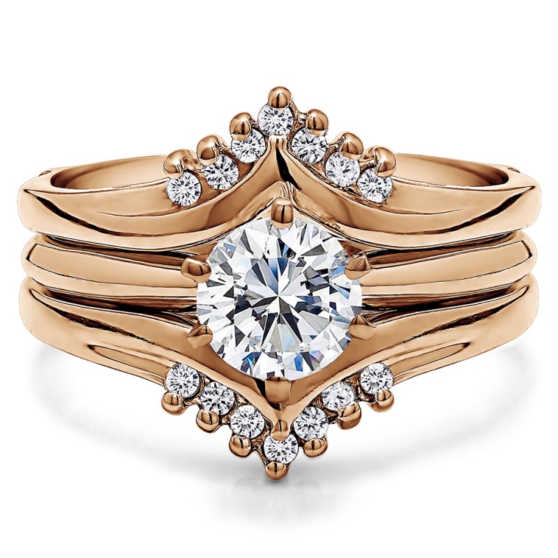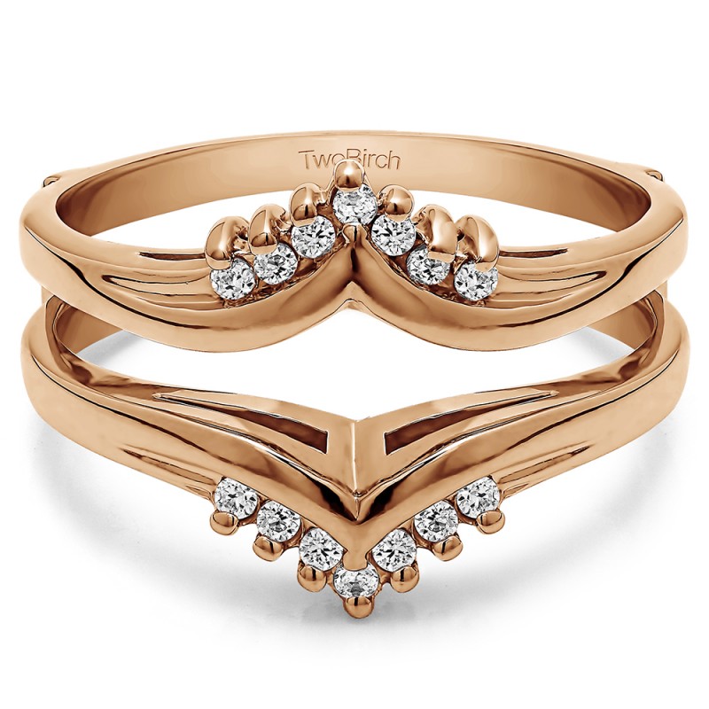 This wedding ring guard has 14 round, prong set stones. Each band measures 2.9 millimeters wide. This ring guard has 0.5 carats total weight. It is made to fit a round solitaire from 0.25 carats to 2, or a princess cut solitaire from 0.5 up to 1.5 carats.