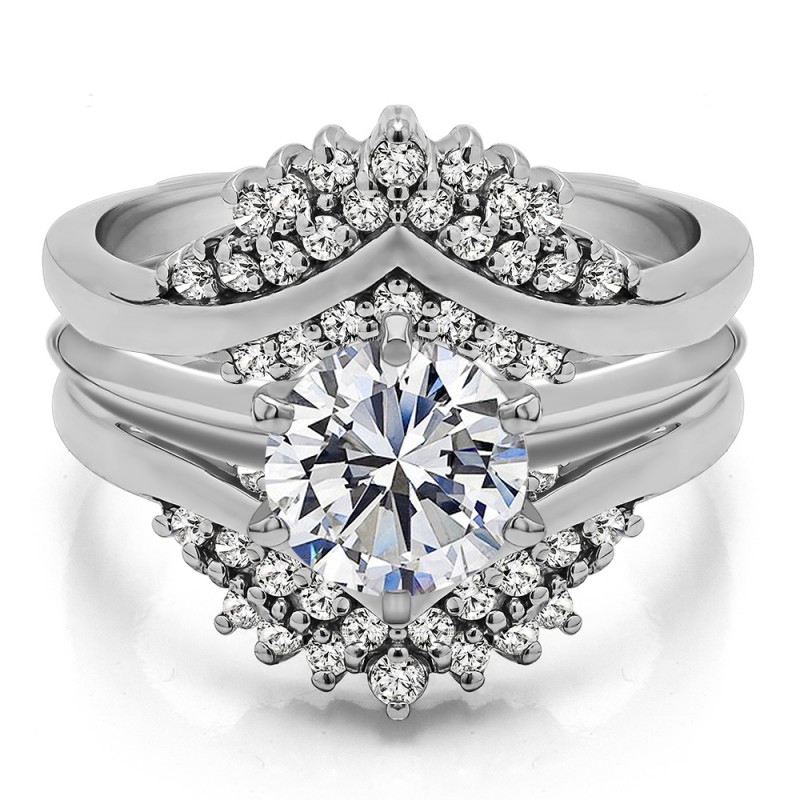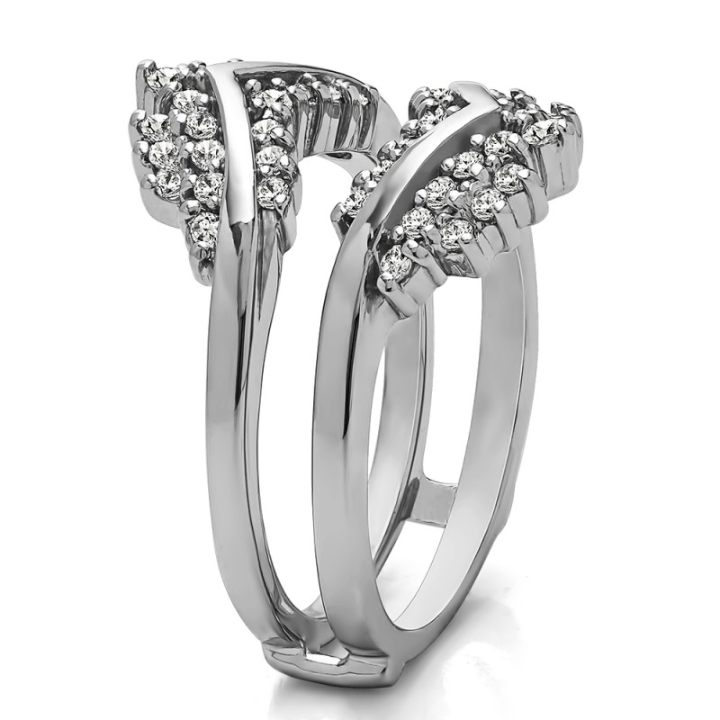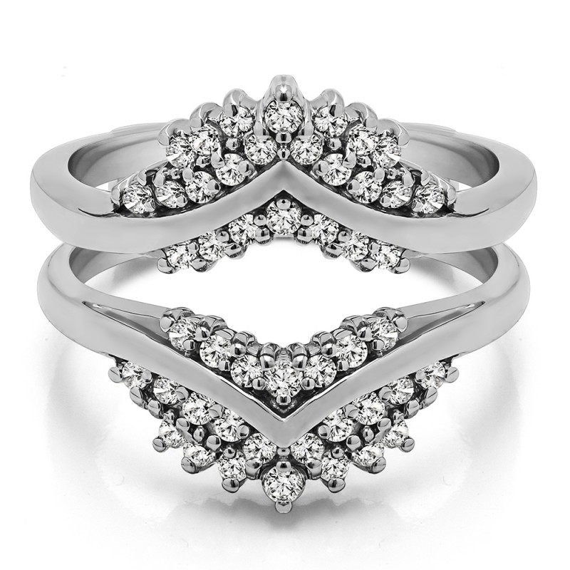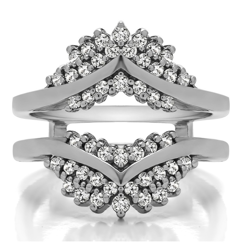 This wedding ring guard has 50 round, prong set stones. Each band measures 2 millimeters wide. This ring guard has 0.52 carats total weight. It is made to fit a round or princess cut solitaire from 0.25 carats to 2 carats.
