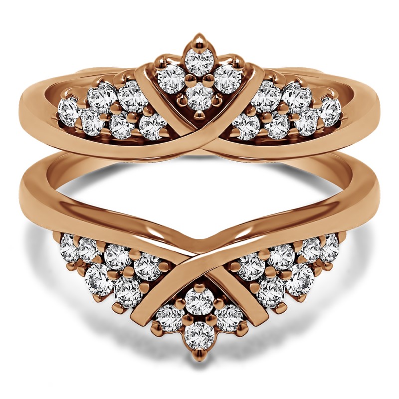 This wedding ring guard has 32 round, prong set stones. Each band measures 2 millimeters wide. This ring guard has 0.52 carats total weight. It is made to fit a round or princess cut solitaire from 0.25 carats to 2 carats.