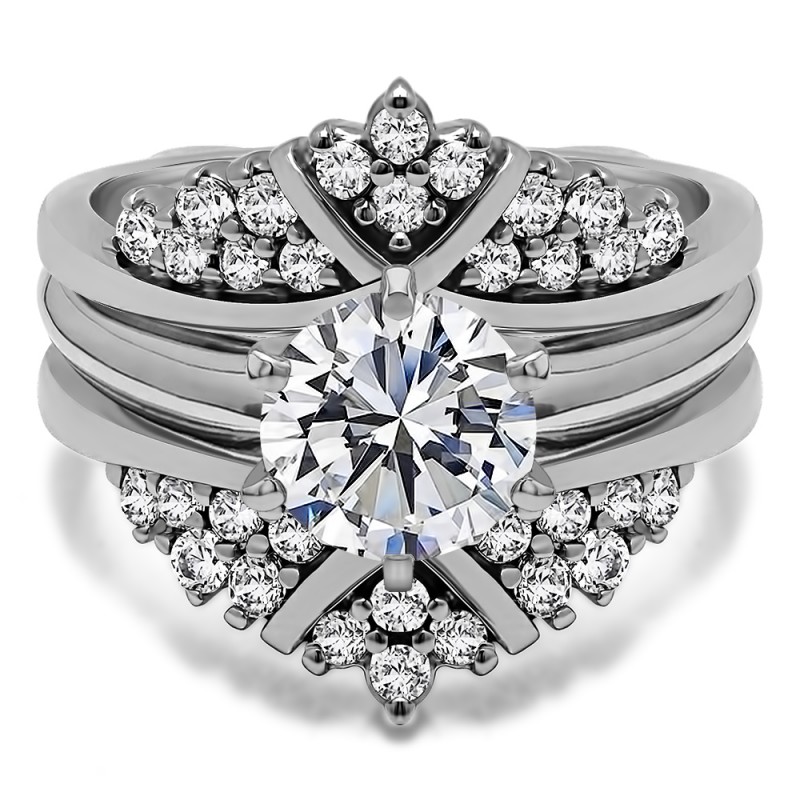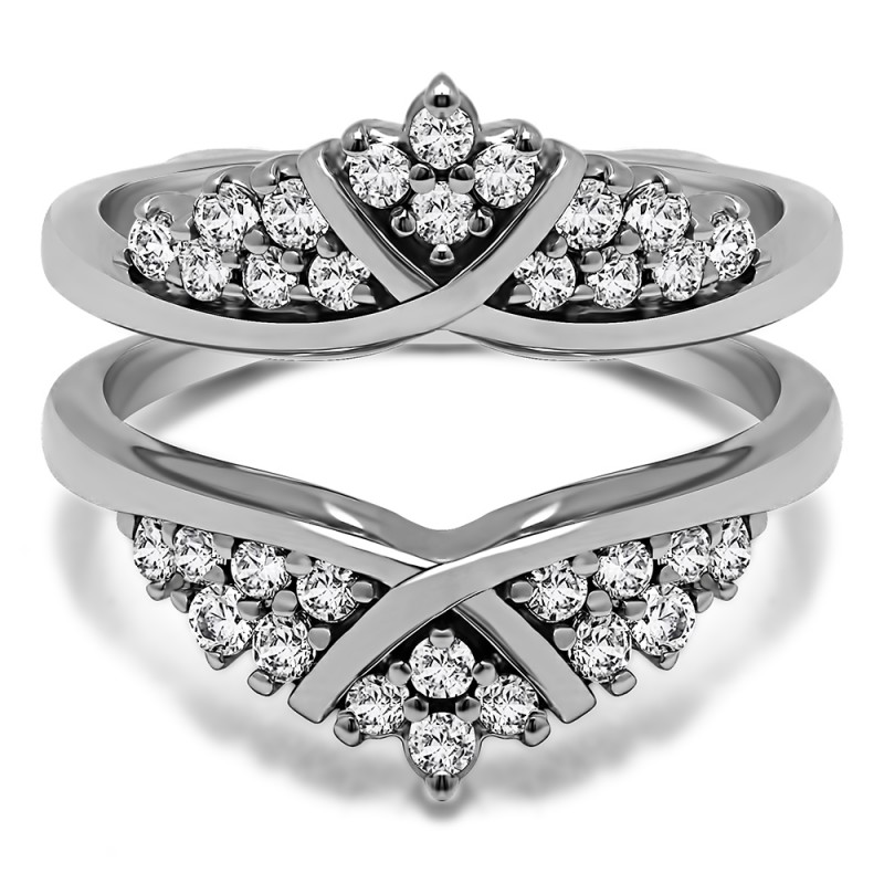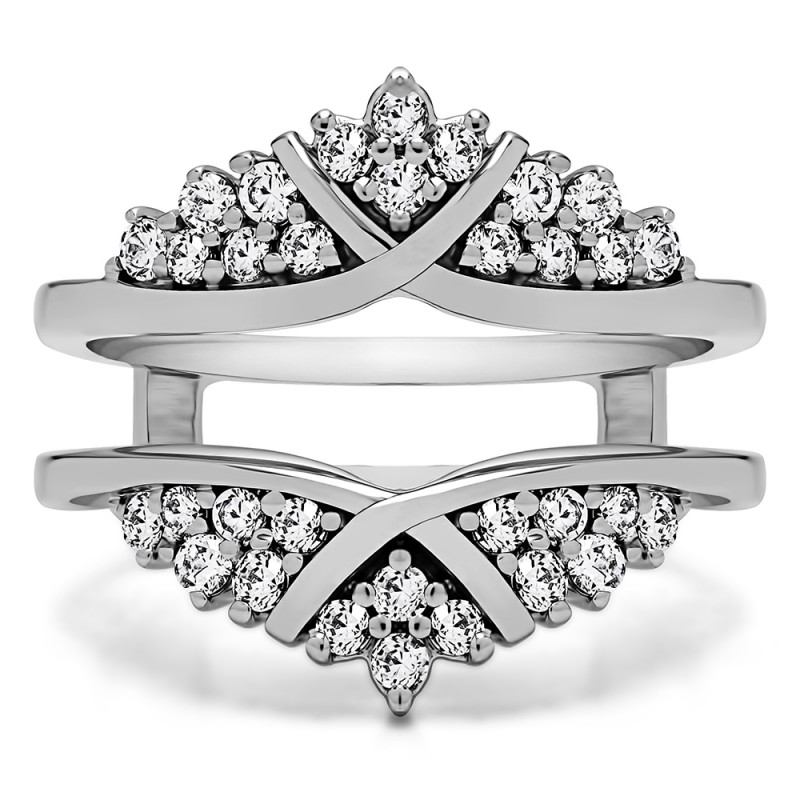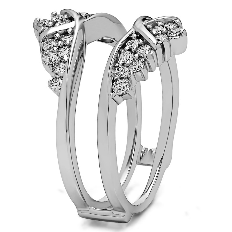 This wedding ring guard has 32 round, prong set stones. Each band measures 2 millimeters wide. This ring guard has 0.52 carats total weight. It is made to fit a round or princess cut solitaire from 0.25 carats to 2 carats.