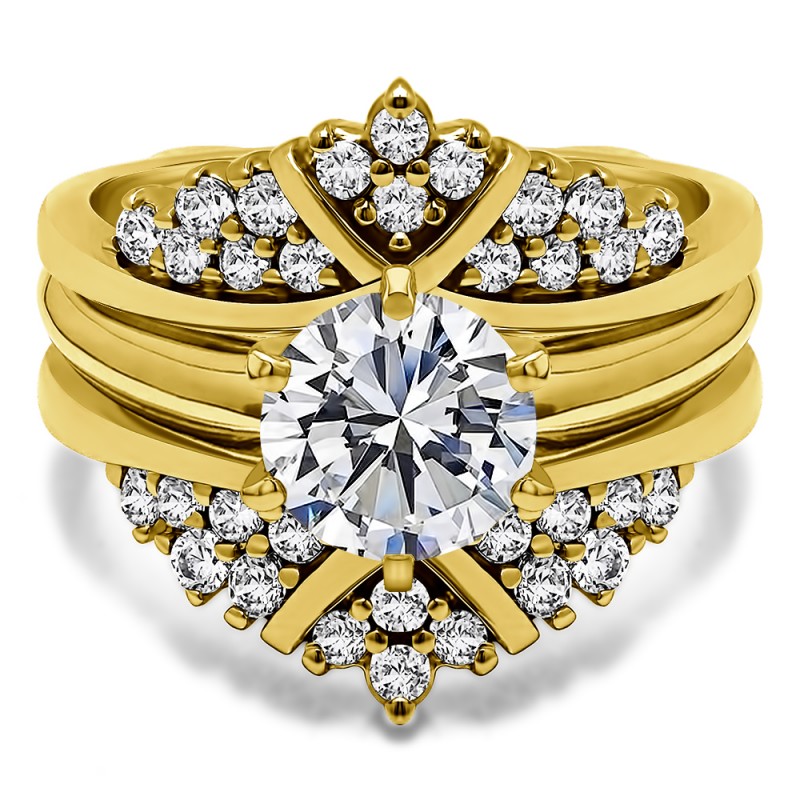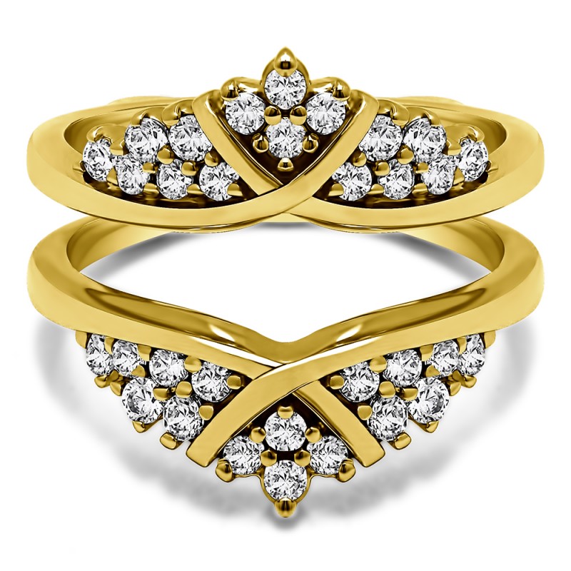 This wedding ring guard has 32 round, prong set stones. Each band measures 2 millimeters wide. This ring guard has 0.52 carats total weight. It is made to fit a round or princess cut solitaire from 0.25 carats to 2 carats.