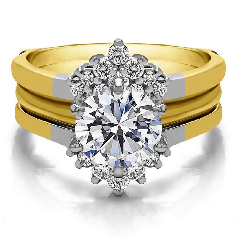 This wedding ring guard has 24 round, prong set stones. Each band measures 2.7 millimeters wide. This ring guard has 0.53 carats total weight. It is made to fit a round solitaire from 0.25 carats to 0.5, or a princess cut solitaire from 0.2 up to 0.2 carats.