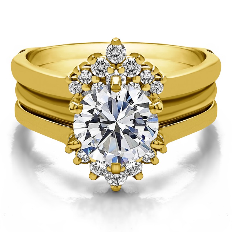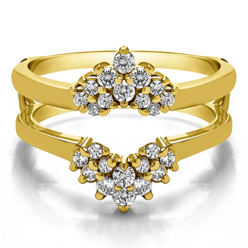 This wedding ring guard has 24 round, prong set stones. Each band measures 2.7 millimeters wide. This ring guard has 0.53 carats total weight. It is made to fit a round solitaire from 0.25 carats to 0.5, or a princess cut solitaire from 0.2 up to 0.2 carats.