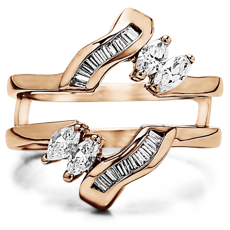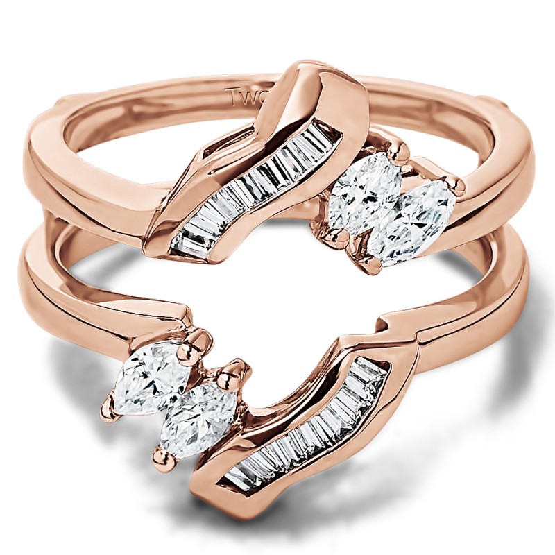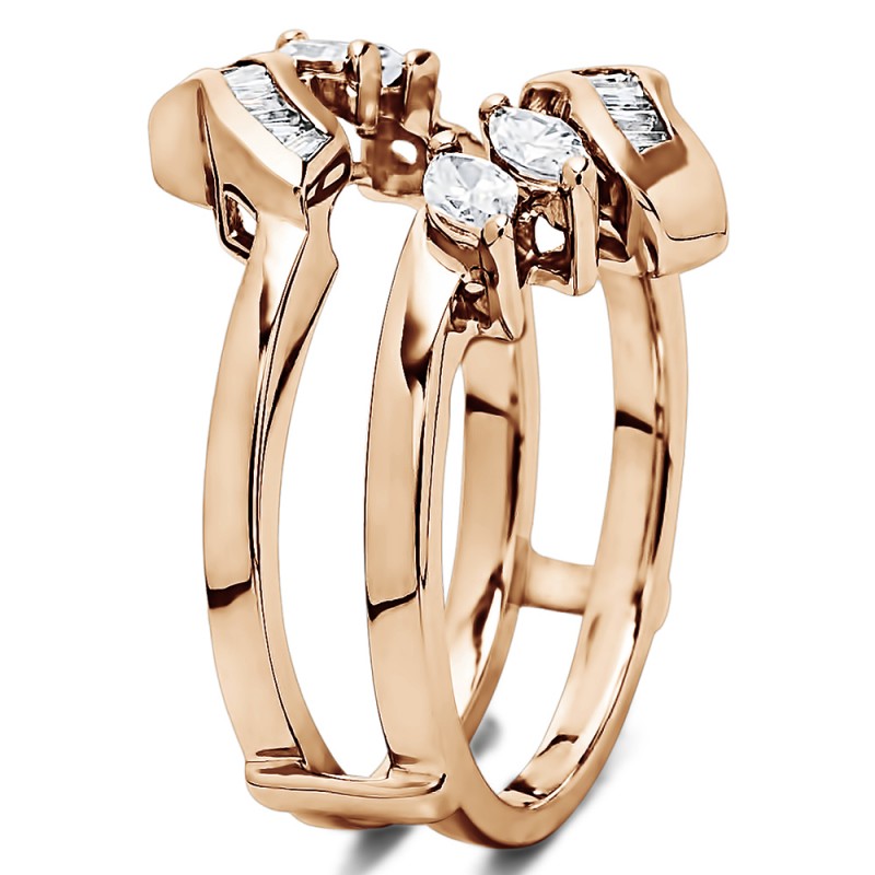 This wedding ring guard has 22 baguette, channel set stones. Each band measures 2.5 millimeters wide. This ring guard has 0.54 carats total weight. It is made to fit a round solitaire from 0.5 carats to 2, or a princess cut solitaire from 0.5 up to 1.5 carats.