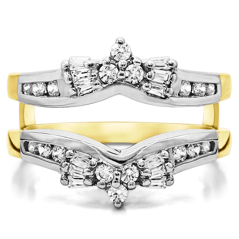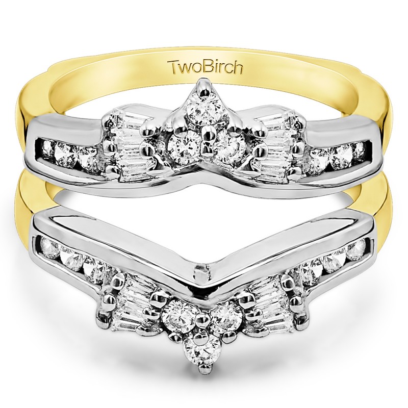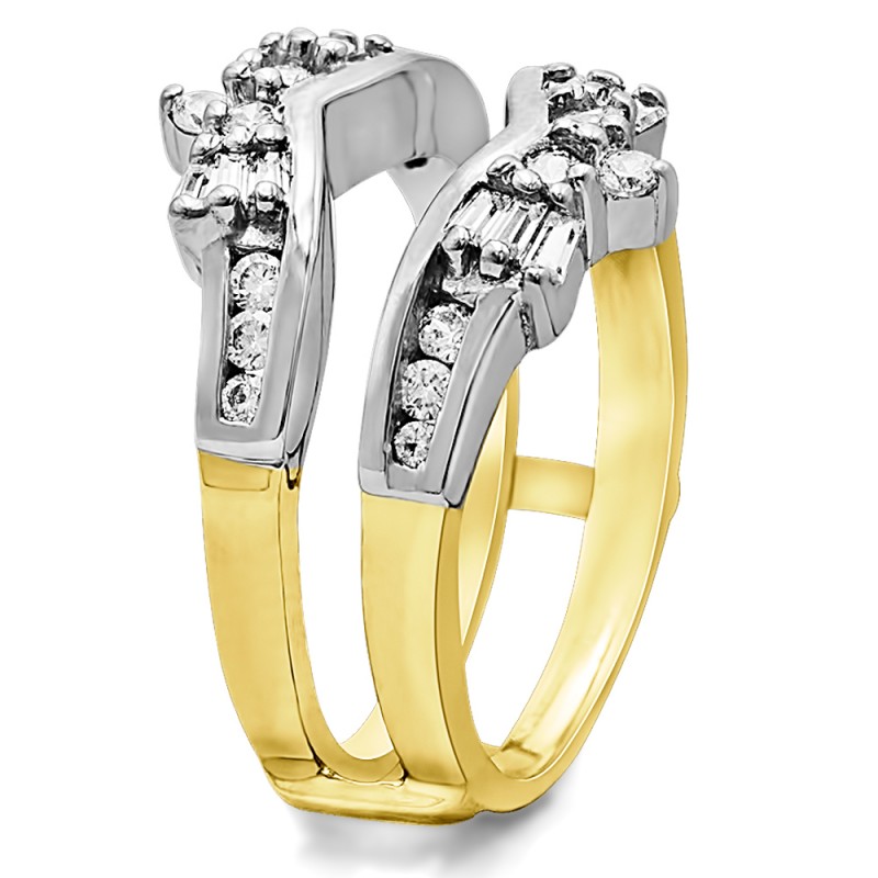This wedding ring guard has 30 round, channel set stones. Each band measures 1.9 millimeters wide. This ring guard has 0.57 carats total weight. It is made to fit a round or princess cut solitaire from 0.5 carats to 1 carats.